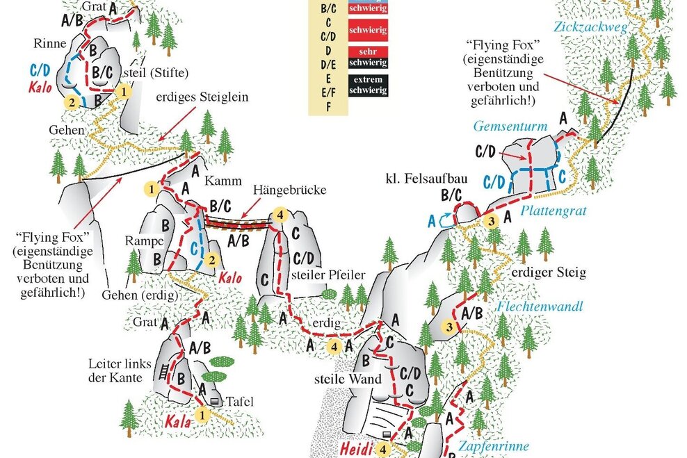Caution: The ziplines on these Via Ferrata routes can only be used with an experienced guide and a brake cable (“breaker”). Without the breaker, riders will crash into the trees at high speed, which could be fatal.