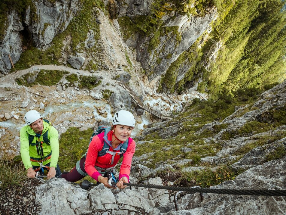 With no hiking passages or ledges for a break, you need a lot of upper-body strength to get from the entrance to the top. Spend a perfect day out by combining the Via Ferratas: Hias, Siega, and Rosina. A little break at the Silberkarhütte will help to ease away the day’s activities.
