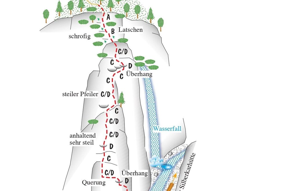 from the exit, head up the footpath for about15 minutes until you reach the hiking trail. Take a right to the Silberkarhütte or to the Siega climbing path. From the Silberkarhütte, make your way back down the canyon.
