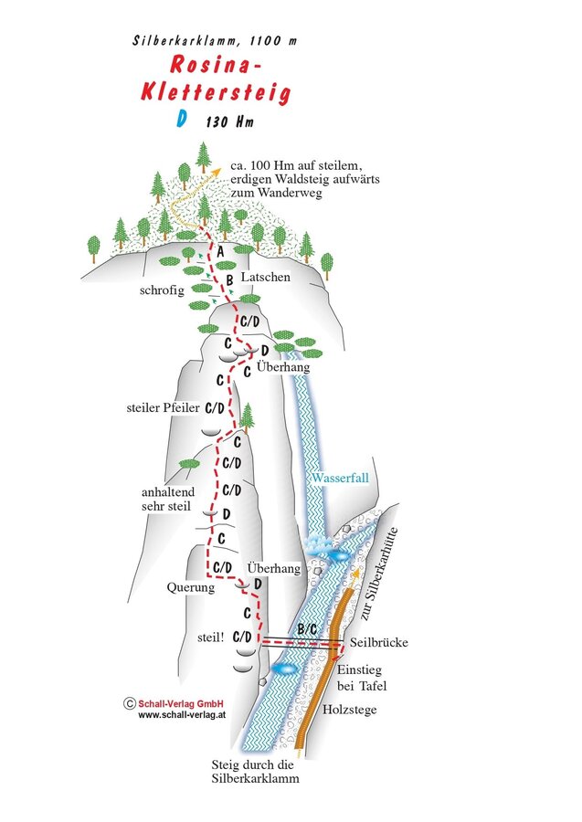 After approaching means of the Hias via ferrata, hike up through the Silberkarklamm to the next rope brideg on the right-hand side, crossing the stream.