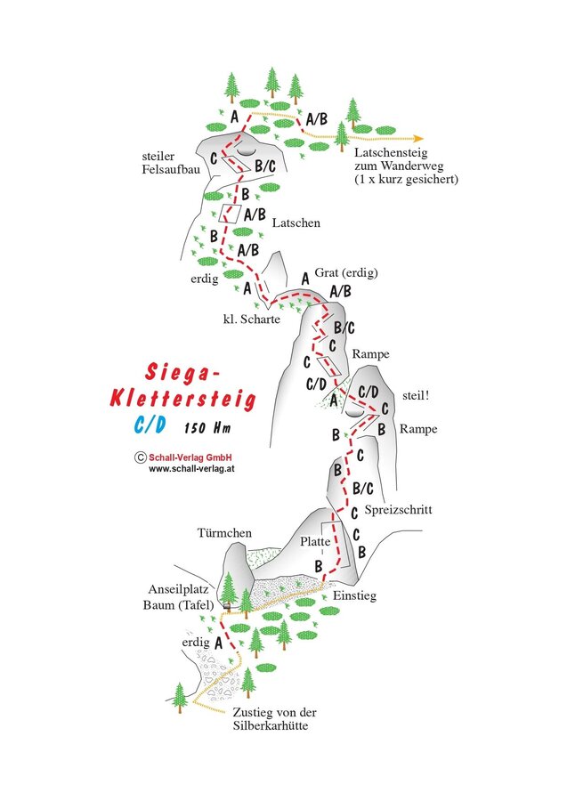 Access: through the Silberkar Canyon to the Silberkarhütte. Follow the ‘Zugang zum Klettersteig Siega C/D‘signpost behind the hut. A steep passage leads up the hill to the entrance, which you reach after passing by a notice board to your right.
