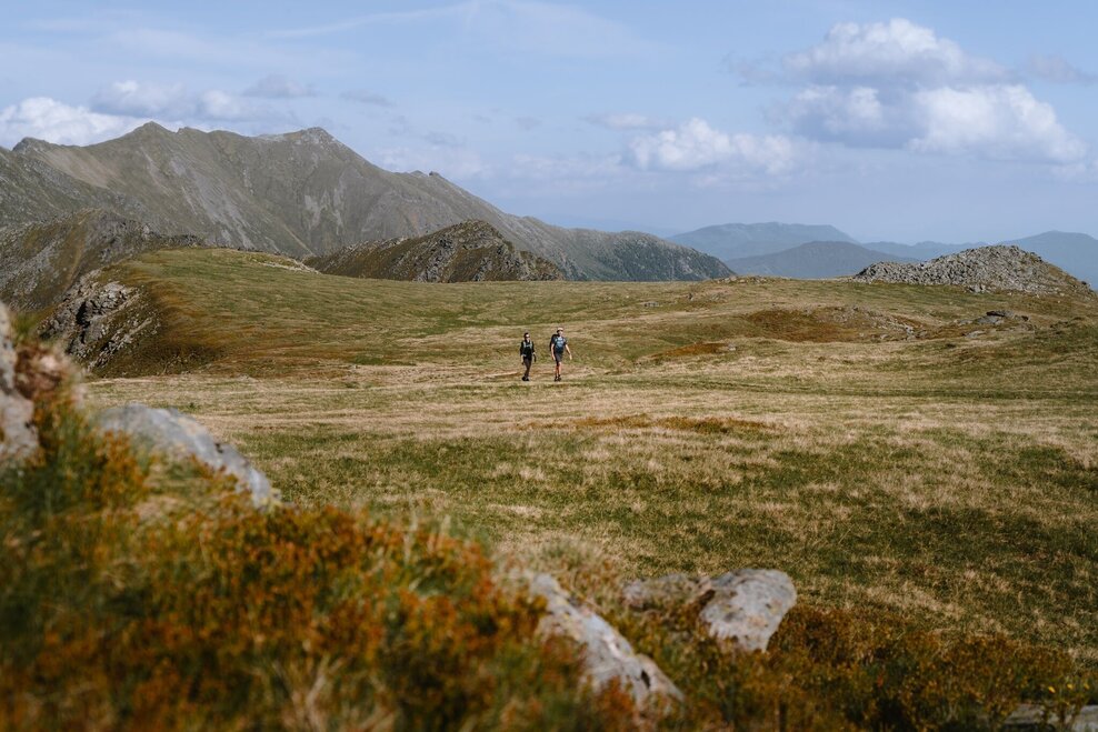 However, the next destinations are no less attractive: on the left bank, the trail climbs steeply over a rocky spur into a small cirque. A gushing stream is the next point of reference, as the trail leads over a short but steep rocky shoulder up to the Etrachböden. This is a gently structured, wide plateau with a magnificent panoramic view of the Tauern peaks. The view down to the lakes and the striking hairpin bends of the Sölkpass road is impressive and clearly shows the difference in altitude that has already been overcome. Up here, it's easy to keep up; small streams cut through the meadows, which are divided by gentle crests.