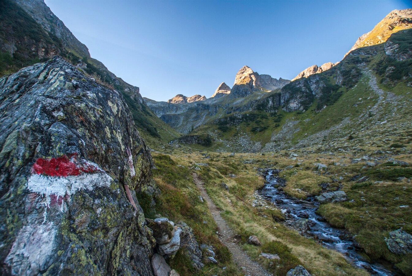 From the huts you again continue along trail n° 777 which is now also marked as trail n° 702 (Schladminger Tauern High Trail and long-distance trail 02 "Central Alps Trail"). You walk up into the "Äußere Lämmerkar" cirque where you then turn-off left and continue on trail n° 777 further uphill into the "Innere Lämmerkar" cirque. Rocky passages and partially loose rocks characterize the way and over an escarpment you ascend to Kapuzinersee Lake, which nestles inbetween an impressive mountain panorama.