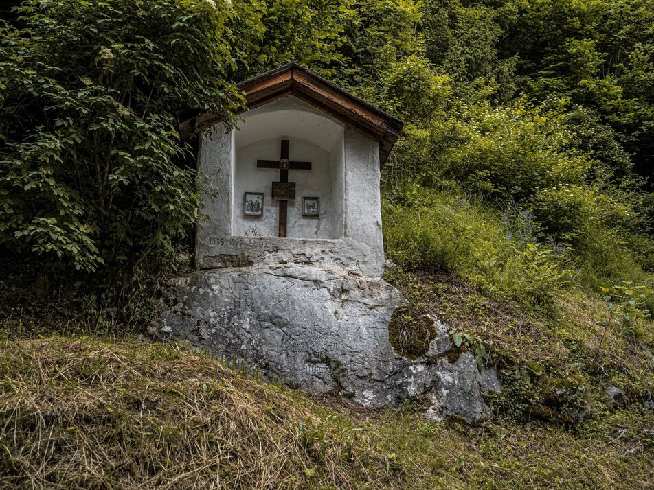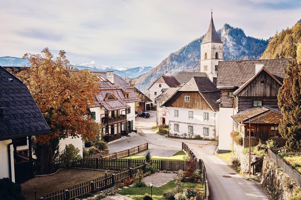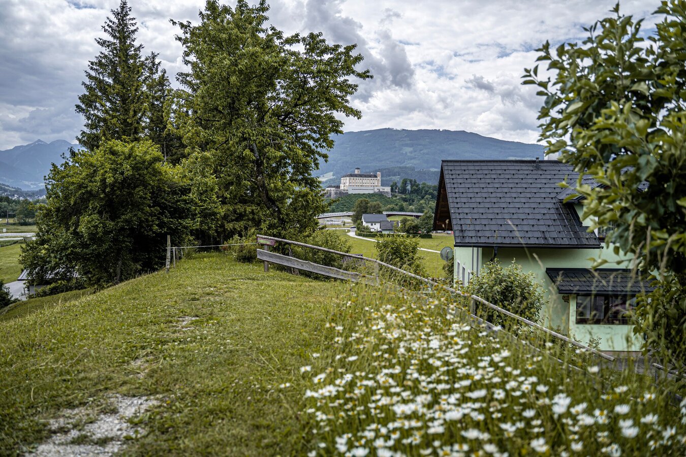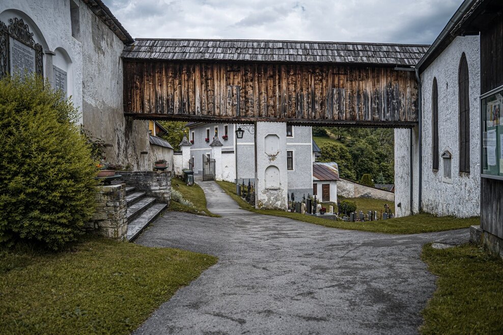 From the north exit of Stainach-Irdning train station, head left/west and then turn right onto Dr.-Frank-Allee. Walk slightly uphill to the main road and cross it to the sidewalk on the other side. Walk to the left to the Red Cross and immediately after, turn right onto Schlossweg. At the first fork in the road, keep left and walk out of Stainach toward Pürgg. The gentle climb leads below the Rantenstein through the forest to Pürgg. You first reach the Schwarzbauer farm and walk down its access road to the eastern end of the small village. Now walk into the village, past the Johanneskapelle Chapel to the intersection by the fire station. Uphill to the right, you can take a small detour to the swimming pool with the Kleines Café, and downhill to the left is the Krenn Inn and the parish church.