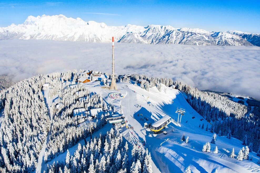 The family-friendly winter hiking trail on the Hauser Kaibling combines scenic and culinary delights at the same time. The Tauern cable car takes you comfortably to the mountain station, where the groomed trail starts. The route leads past catered huts to the Kaibling Alm. A perfect winter experience for connoisseurs who appreciate both the breathtaking view of the Dachstein massif and the opportunity to stop off at cosy huts.