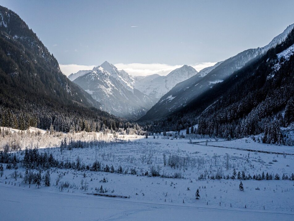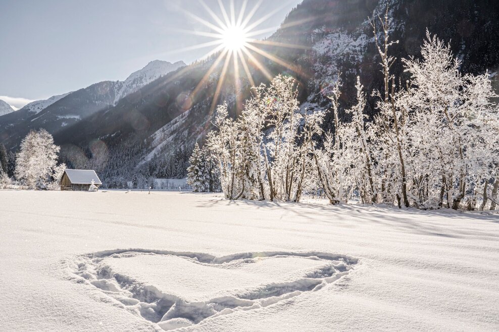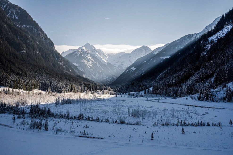 From Gasthof Tetter, follow the signs into the valley along the Wilde Wasser theme trail. The trail accompanying the Untertalstraße road is prepared for pedestrians by the cross-country skiing machine. After just a few metres, you will reach your first highlight - the Aussichtsstadl Tettermoor. Here you can enjoy a marvellous view over the snow-covered moor in winter. Continue into the valley past the lookout tower through the forest to the Waldhäuslalm (TIP: you can enjoy curling here). Directly after the Waldhäuslalm, turn right, cross the bridge over the Untertalbach stream and continue along the cleared forest path to the Sondl-Alm. Along the way you have a wonderful view of the cross-country ski trails, which also lead along the Untertalbach stream to the Sondl-Alm.