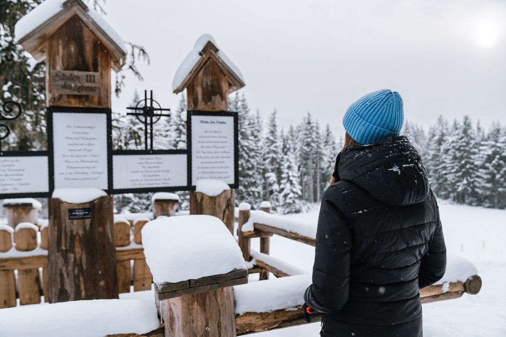 Bei guten Schneeverhältnissen gehts mit guten Winterschuhen oder Schneeschuhen und Skistöcken unterhalb des Ackerlhofs rechts die Forststraße hinauf. Es geht den Waldrand entlang durch den Wald hinauf bis zu einer Lichtung. Von hier aus hat man eine atemberaubende Aussicht auf die umliegenden Berge Stoderzinken, Kamm und Grimming. Rechts weiter gelangt man zur Friedensglocke. Danach quert man die Wiese zur Stöckelbergalm (nicht bewirtschaftet). Man folgt den Schautafeln bis zum Schneerosenhügel. Dort geht es wieder hinab und zurück zum Ausgangspunkt.