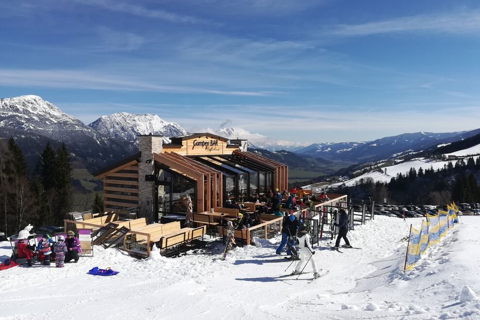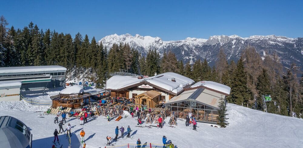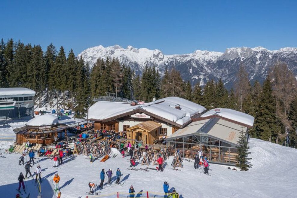 Winter hiking in front of a stunning mountain landscape.The route leads from the Natur- und Wellnesshotel Höflehner (Gumpenberg) along a signposted winter hiking trail to the Knapplhütte and the mountain station of the chairlift "Höfi-Express 1". Therefore, one route (uphill or downhill) can also be covered with the chairlift.