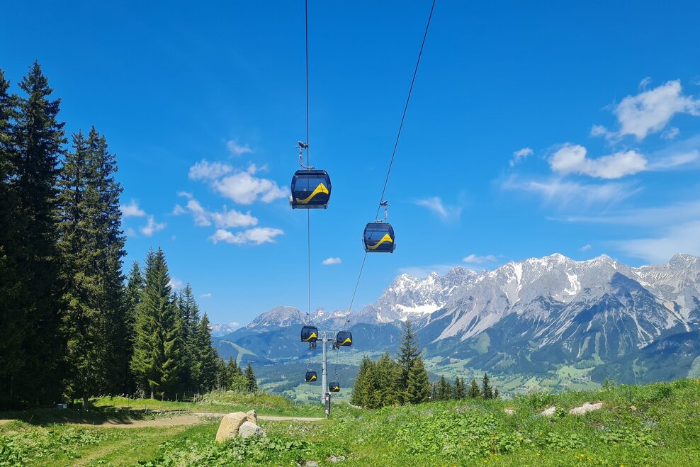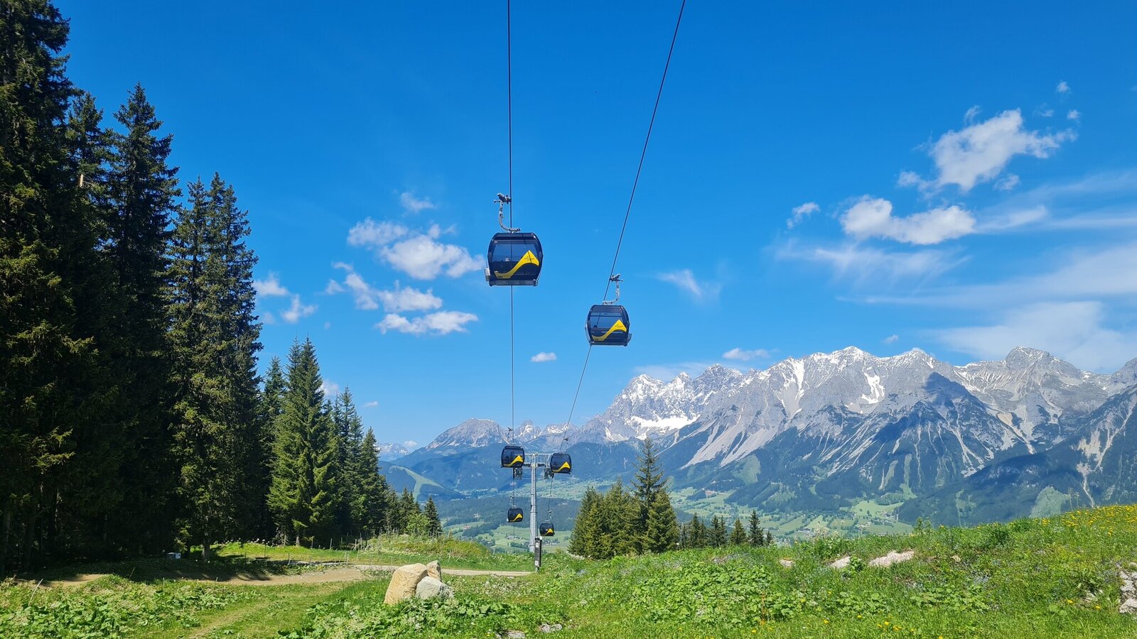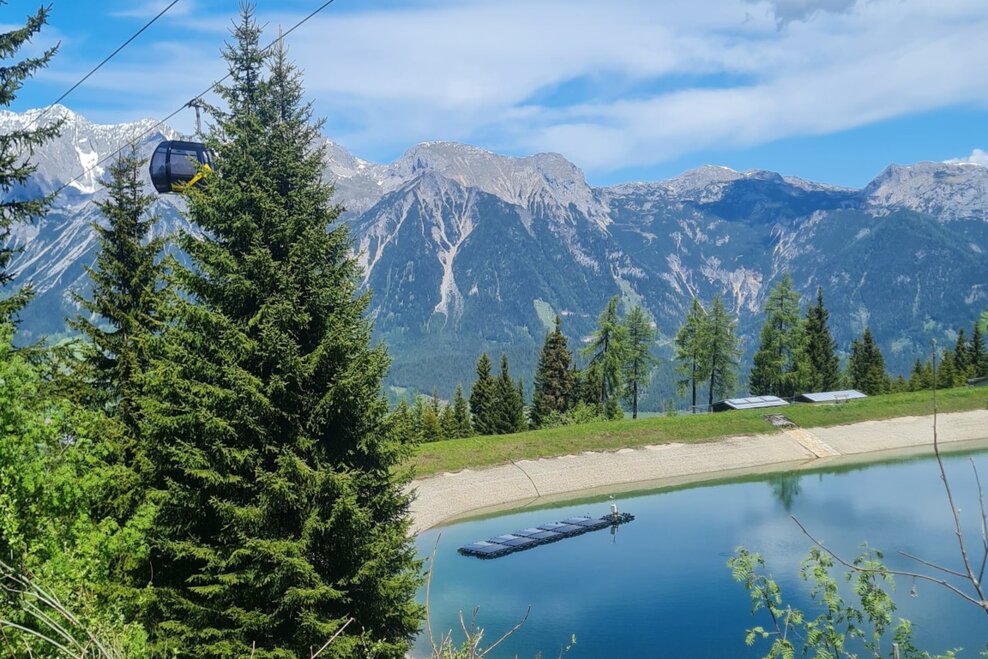 Further downhill you walk through sections in the forest or along the FIS Alpine Downhill slope. A bit below the Bruckmoos pond you walk across the meadow (ski slope in winter) and head towards the Lärchkogel slope. Here you turn off from trail n° 779 and walk towards the mountain terminal of the 1st section of the Planai cable-car, which you will reach after a couple of minutes via several switchbacks. At this point was the start of the Alpine World Championships' Super-G events.