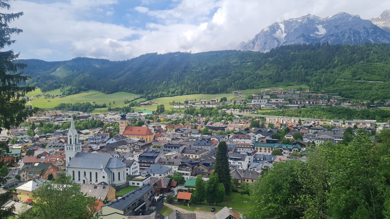 The Harreiterweg then leads into the forest, where you turn off on the hiking trail just after a few meters in the forest and walk down 2 switchbacks and again reach the Harreiterweg. Follow it to the right for a few meters and then turn off left onto trail n° 53 again, which takes you further downhill towards Schladming. After about 20 to 25 minutes descent through the forest you reach a great viewpont on top of the final slope of the Planai ski area. Here you have a great view to the finishing area of the World Cup events and the legendary Nightrace, as well as across the beautiful mountain town of Schladming.