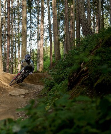 The bike area is located on the Planai and to get there comfortably, you take the new 10-person Planai cable car up to the top. Arrived at the top station there are 2 ways to get to the bike area. For all beginners there is the Hopsi Express (inclined lift) and with it directly down to the Bike Area. Experienced bikers can ride the Rookie Downhill (red route) to the bike area themselves.