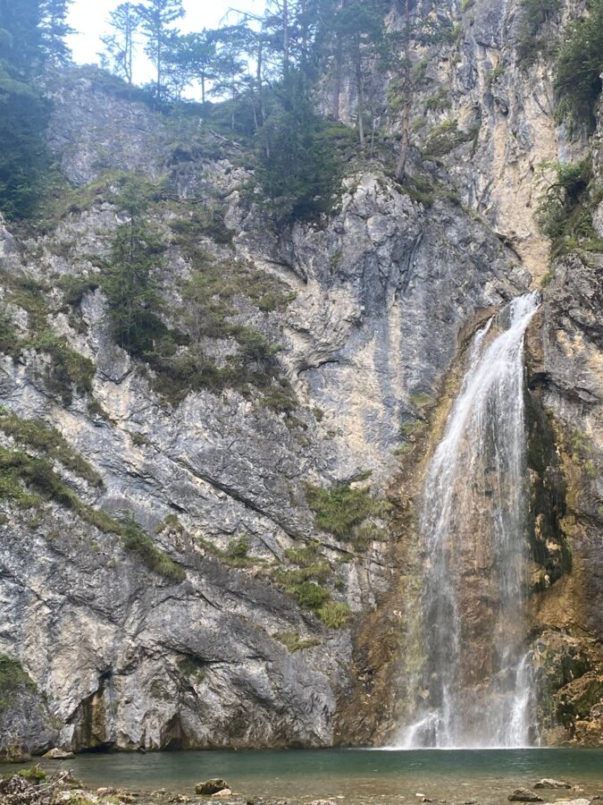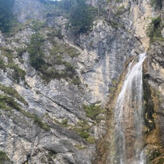 The starting point for the hike to the waterfall is at the parking lot directly after the Salza entrance. The easy trail takes around 30 minutes through an idyllic forest, past the babbling Salzabach stream, over wooden bridges and well-secured steps and is also ideal for families. At the end, the impressive waterfall awaits you, with its 40-metre-high spray thundering into the turquoise lagoon.