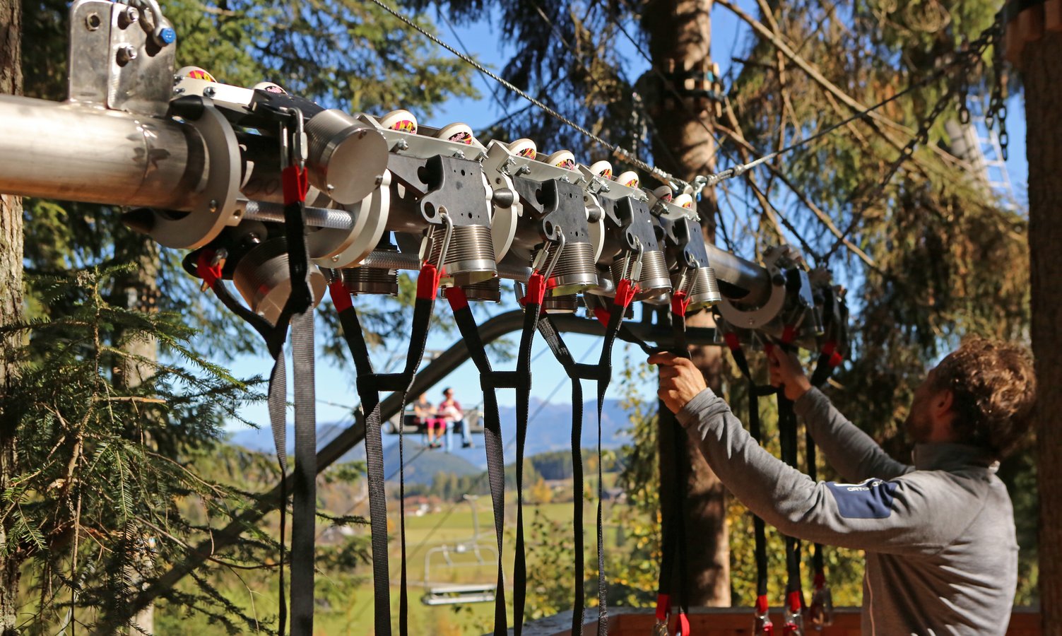 Suspended on a steel tube, you float almost silently through the forest between the treetops of meter-high spruces.