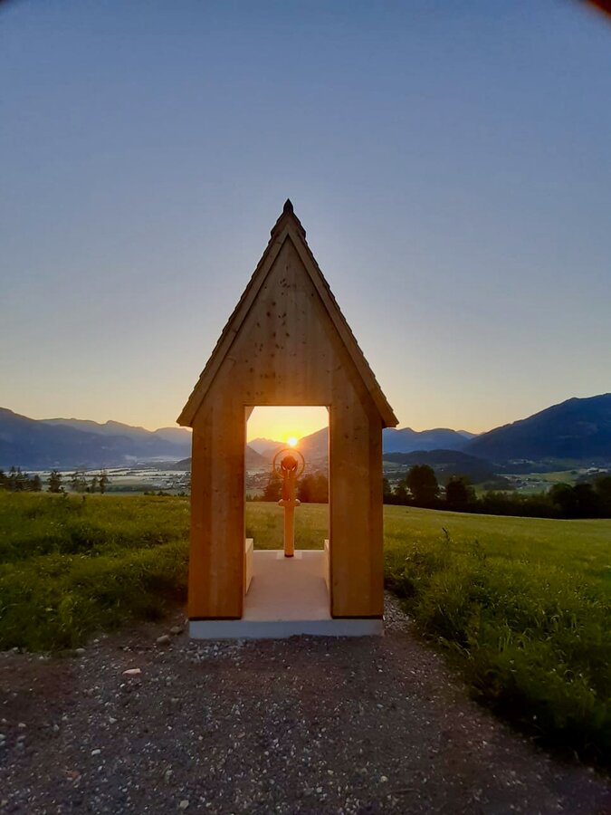 A sunrise walk with the Gstemmer wayside shrine on Bleiberg mountain offers a magical moment. The morning sunbeams breathe a special atmosphere into the sculpture. The two-church axis view (Irdning-Aigen) perfectly rounds off this moment.