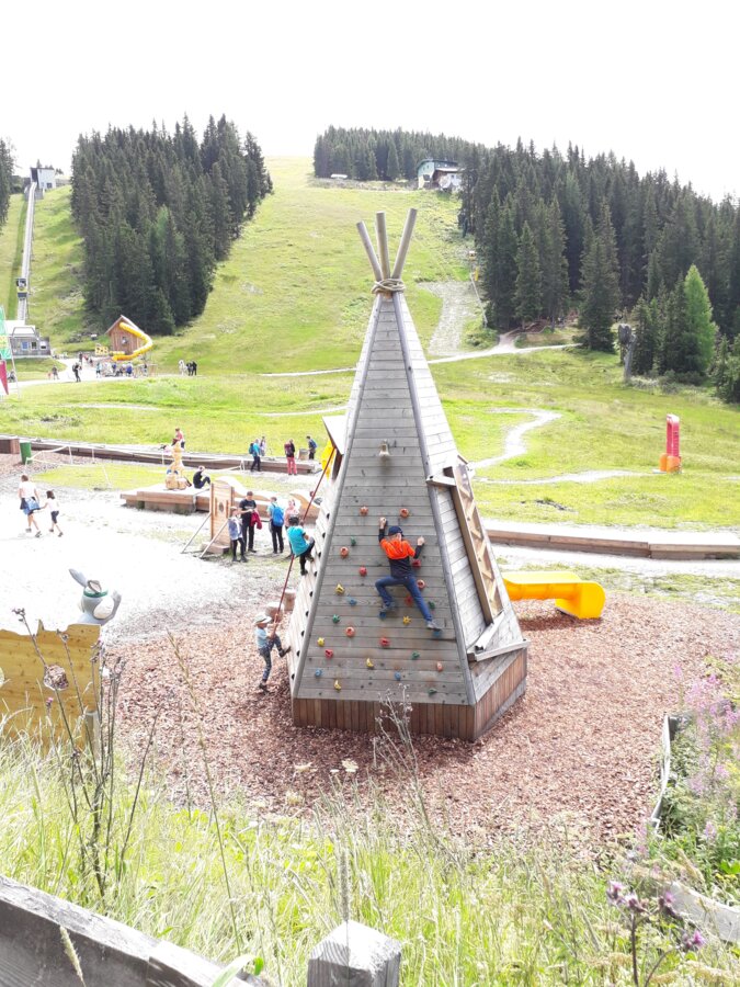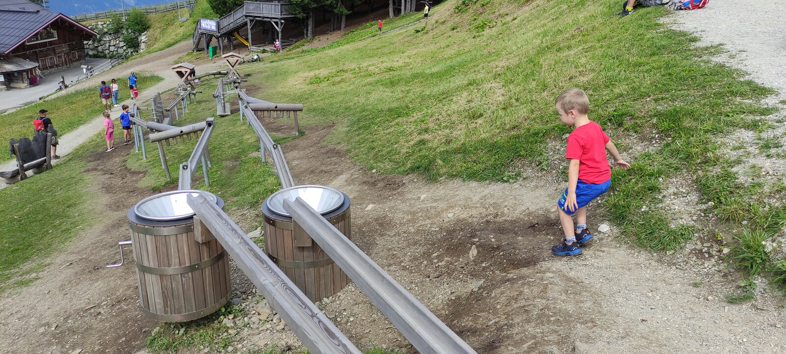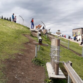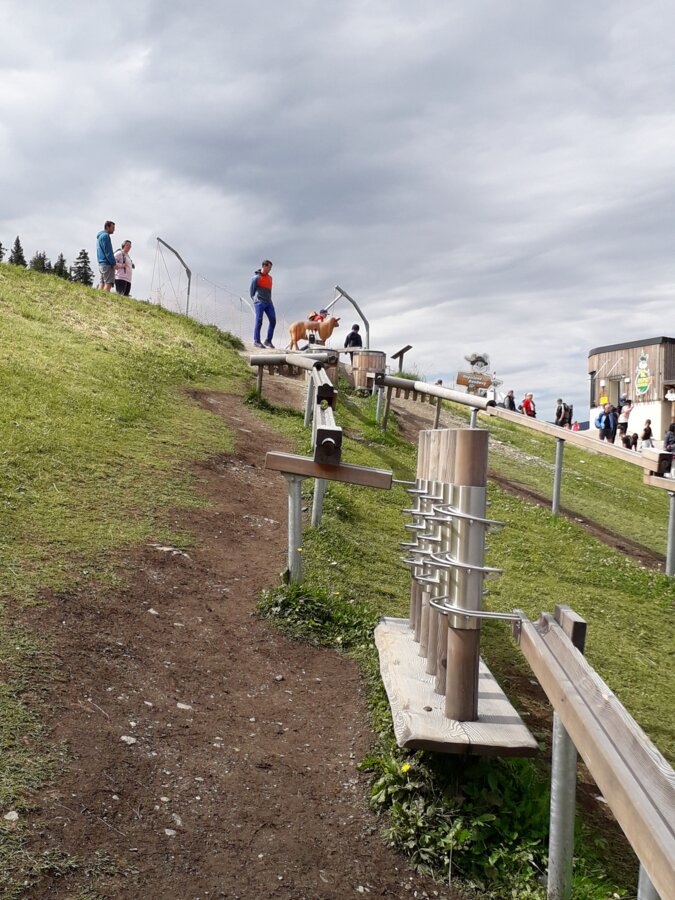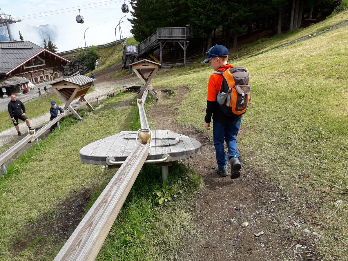 Nach der Fahrt mit der Gondel, ging es erst einmal hoch zum Gipfel! Oben angekommen ließ sich bei einer wunderschöne Aussicht, allerdings auch das kommende Wetter erkennen. Der Weg rund ums Hopsiland fanden wir ok, da kennen wir aber auch schöneres! Nichts desto trotz, ein schöner Ort bei am besten gutem Wetter! Unsere Kids hatten aufgrund dessen auch an Lust verloren, sodass es nach 2 Std. wieder bergab ging.
