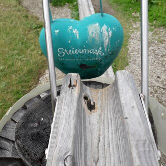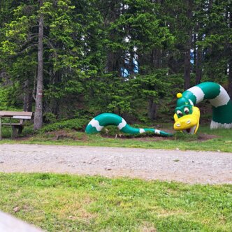 One of Hopsi’s favourite places to be is the gigantic piste caterpillar made from wood. He likes to think about the winter on the Planai even when it’s hot and summery outside – logical right? Next to the caterpillar, our old Dachstein-Gondala invites to play, climb and have fun.