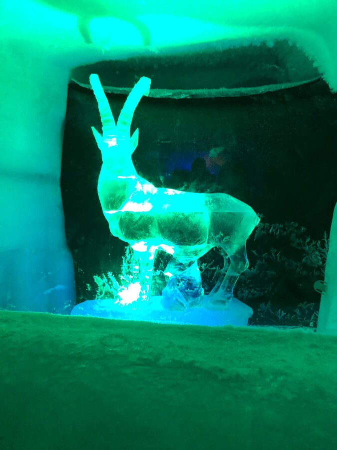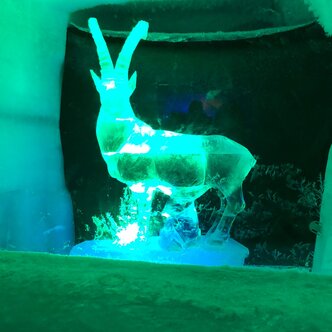 Our ice palace team, consisting of Hans Böhmer and Peter Strassegger, created a tour through the alpine adventure world together with the sculptor team led by Michael Bachnetzer. A tow lift, a summit cross, a climber and a mountain biker were carved into the ice with great attention to detail.
