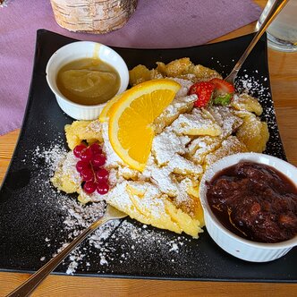 Breathe in the fresh mountain air high above and let your gaze wander over the extraordinary Alpine panorama. Yes, the region around Haus im Ennstal has a lot to offer. And at the Krummholzhütte on the Hauser Kaibling in Styria, pure nature and the finest culinary delights come together. Here, Daniel Mairamhof and his team cater to their guests' physical well-being with fine home cooking. You can enjoy everything Styrian cuisine has to offer here in the best quality and made from regional products. It's no coincidence that the Krummholzhütte is one of the “Kulinarium Steiermark Hütten” (Styrian culinary huts). From juicy Kaiserschmarren in a pan to warming soups and fine snacks, a wide selection of delicacies is on offer. The wine list is also stocked with the best wines. Whether in summer after a long hike or in winter for a break right on the slopes, here you have found a place to rest and enjoy yourself.