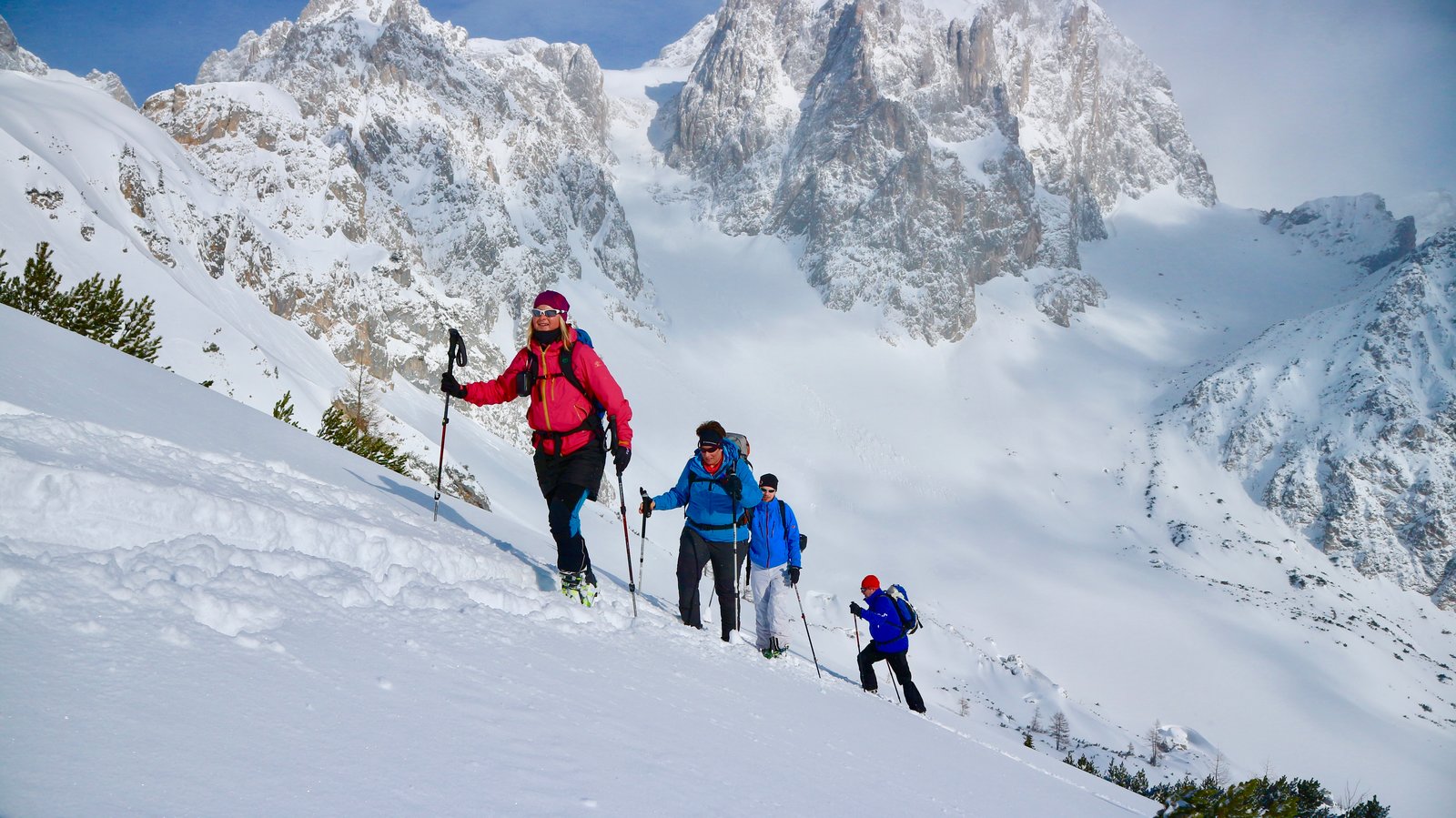 In winter we offer freeride days, ski tours, snowshoe mountain tours, ice climbing courses, avalanche and ski technique courses.