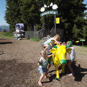 Nach einer Wanderung ist es mit Kindern wunderschön auf der Schaf Alm einzukehren - mit dem tollen Spielplatz könnte man bis zum Abend bleiben - und dieses Lamm hat sogar die Großen verzückt