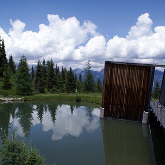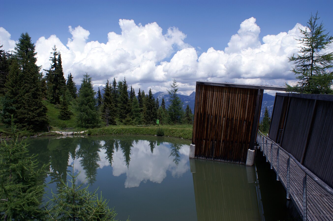 "Ort der Besinnung" heißt dieser angelegte See aus gutem Grund. Doch tagsüber, wenn die Besucher ihre Runden drehen, ist es mit der Ruhe nicht allzu weit her. Aber wenn man die Chance bekommt, den Ort und den Ausblick alleine auf sich wirken zu lassen, ist es ein besonderes Erlebnis. Erst recht, wenn die sich im See spiegelnden Wolken den Dachstein so schön in Szene setzen.