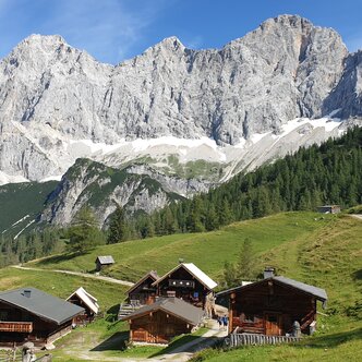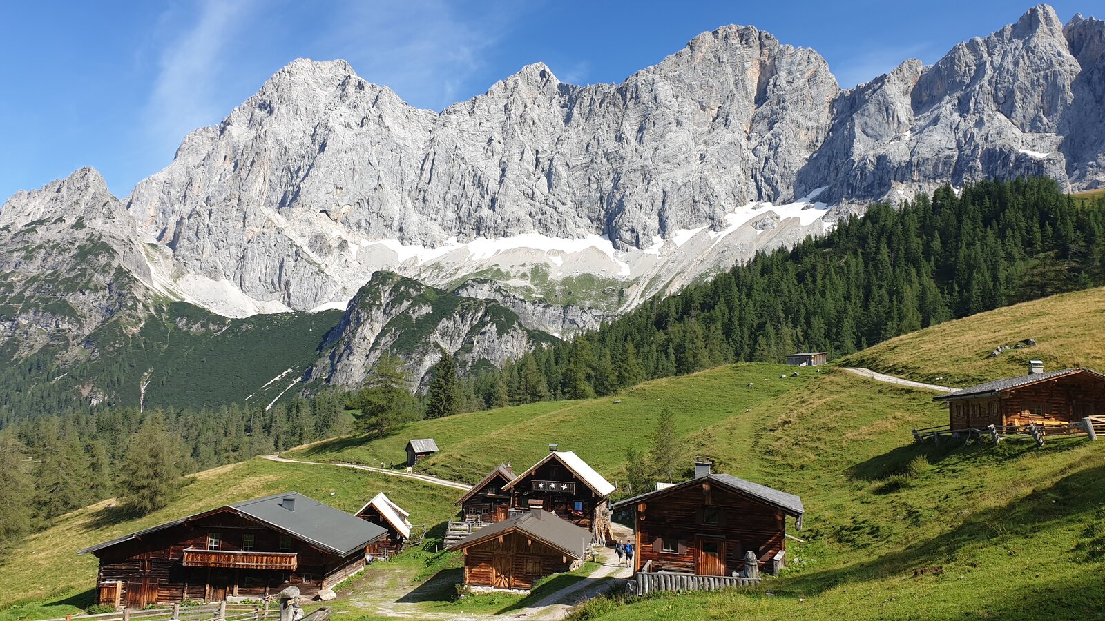 Fantastischer Ausblick über Hüttendorf am Fuße des Dachstein