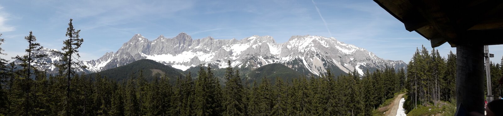 Blick zum Dachsteinmassiv vom Aussichtsturm beim Rittisberggipfelkreuz