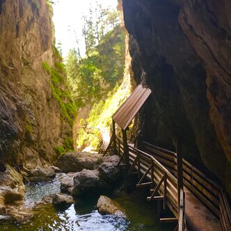 In millennia of digging, the Wörschachbach stream has rushed and wildly dug its way through the rock. It is hard to believe that more than 130 years ago traders were still driving horse-drawn carts here and lumberjacks were laboriously using the power of the water to transport the wood down to the valley. The later construction of the Klammsteig was a true pioneering achievement.