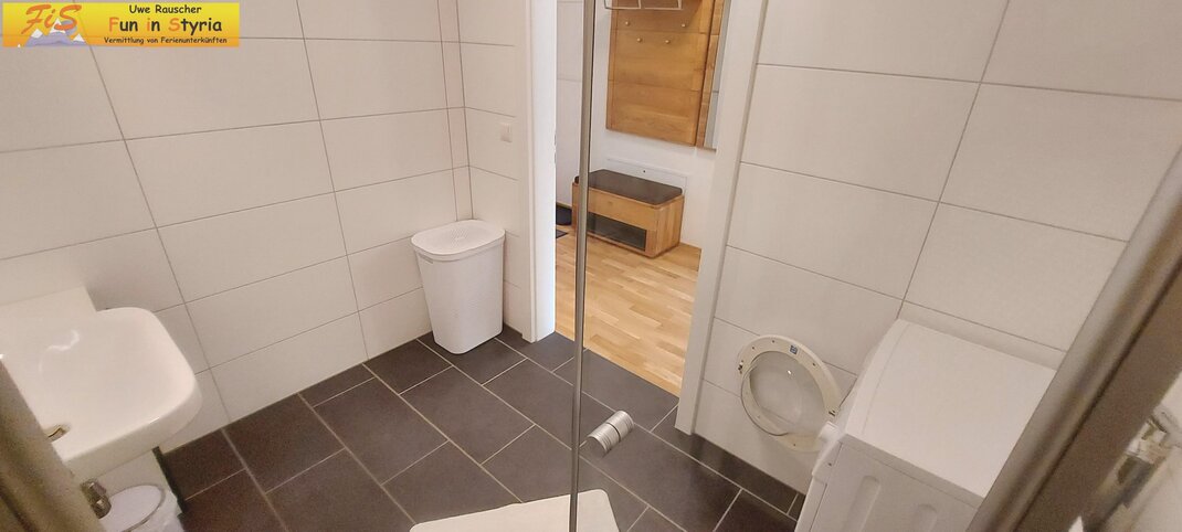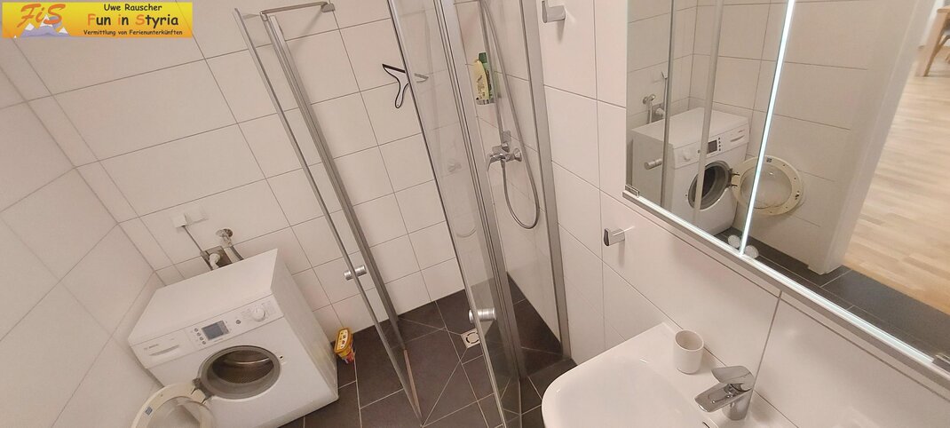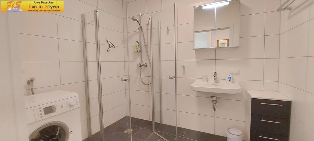 Badkamer met douche, wastafel, haardroger en wasmachine.