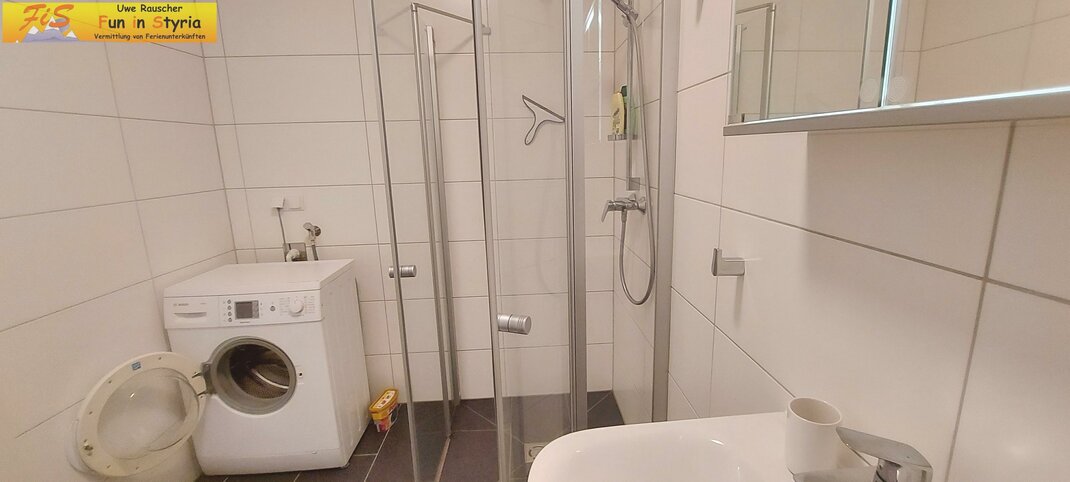 Badkamer met douche, wastafel, haardroger en wasmachine.