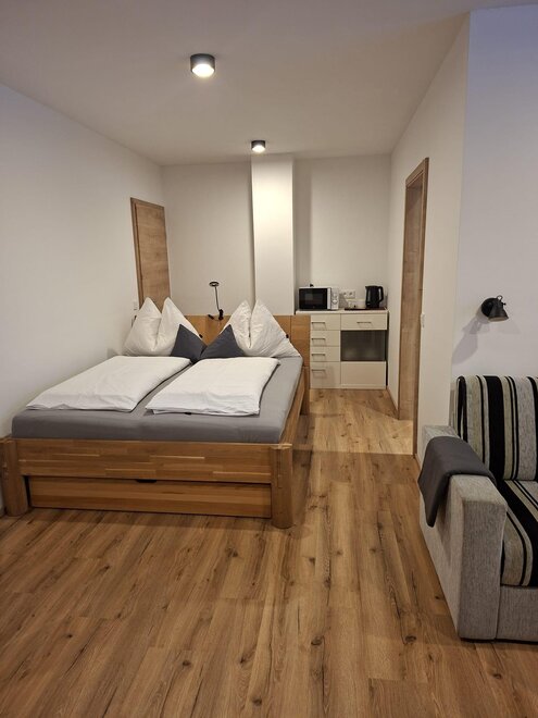 Ons appartement met uitzicht op de tuin is uitgerust met een hal, een slaapkamer, een woon-slaapkamer (met Sat-TV) en een volledig uitgeruste kitchenette, evenals een groot balkon.