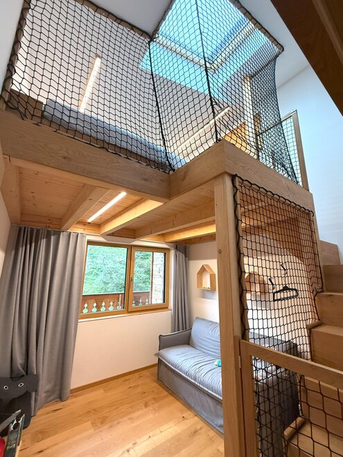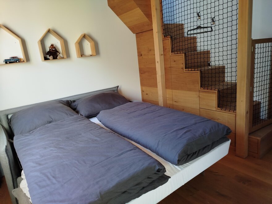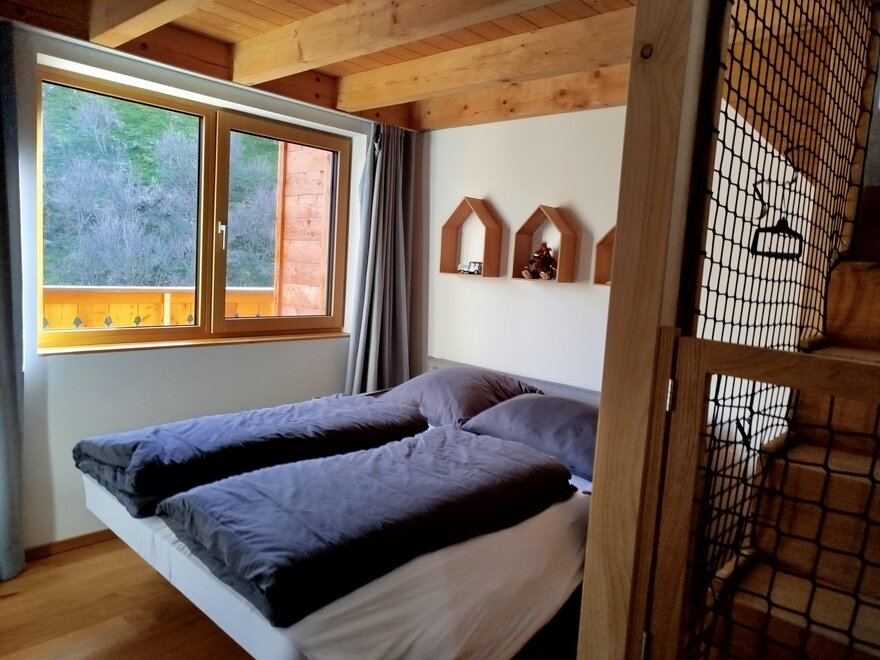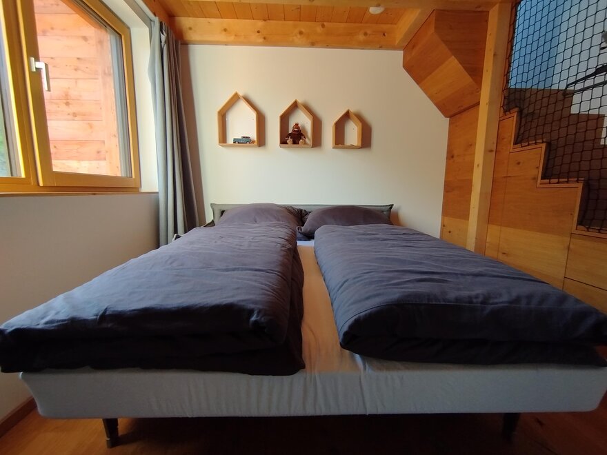 - 1 slaapkamer/tweepersoonsbed en kinderkamer/ingebouwde tussenverdieping (3 matrassen van 100 cm/matrassenopslag, uitklapbare bank)