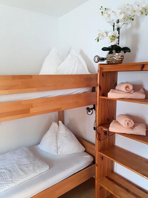Het "Apartment Julius" biedt ook plaats voor tot 6 personen, heeft 2 slaapkamers (1x met een dubbelbed, 1x met stapelbed) en een slaapbank voor twee extra gasten. De badkamer omvat douche en bad, het toilet is apart.