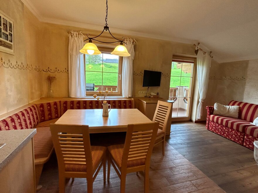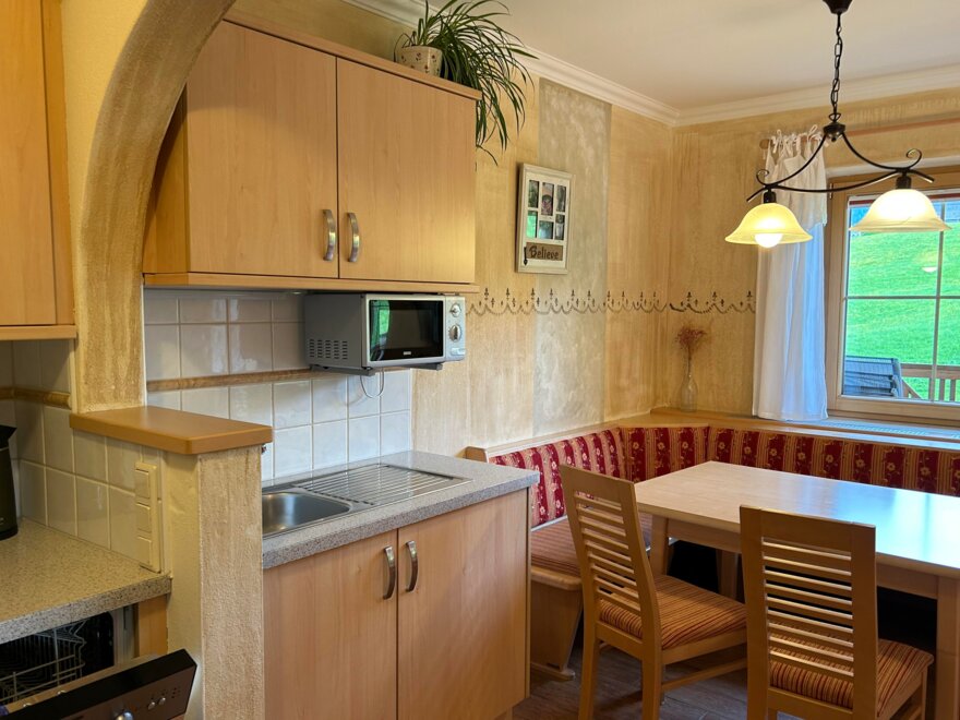 Gezellig appartement met 2 slaapkamers, volledig ingerichte woonkeuken met zonneterras, 2 badkamers en aparte toiletten. De volledig uitgeruste keuken beschikt over een oven, magnetron, vaatwasser, koelkast met vriesvak, espressomaker, waterkoker en voldoende servies en bestek. Voor beddengoed, handdoeken, vaatdoeken en saunadoeken wordt natuurlijk gezorgd. Dit appartement heeft een balkon en terras met uitzicht op onze prachtige bergwereld. Het appartement bevindt zich op de 1e verdieping. Ons huis ligt direct aan de skipiste in een zonnige, rustige en toch centrale locatie!