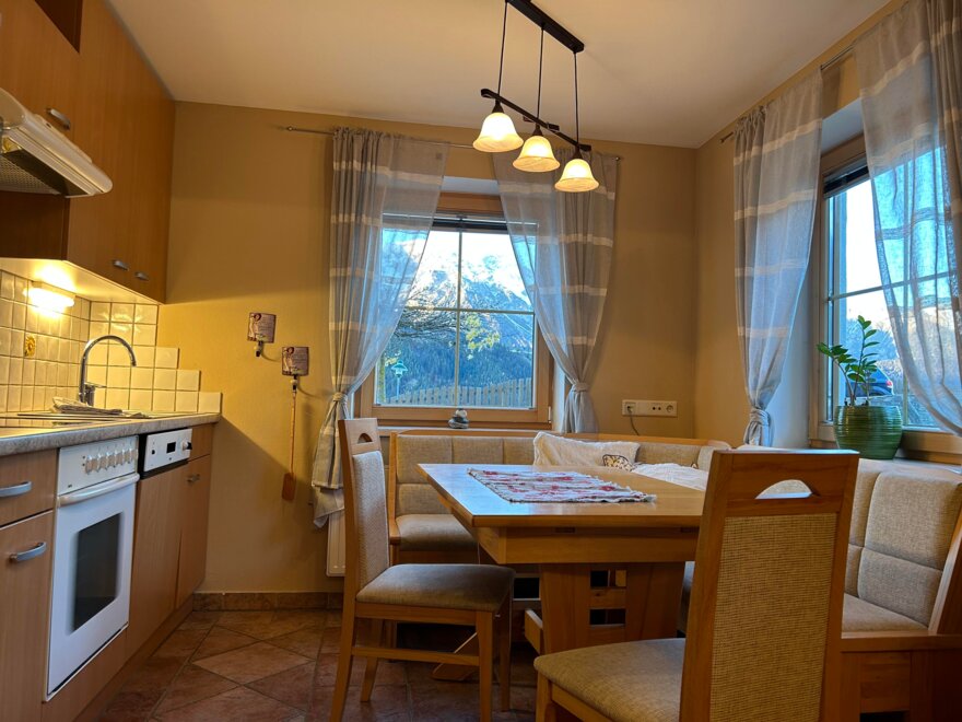 Onze ruime appartement, voor maximaal 4 personen, beschikt over 2 slaapkamers, 1 lichte woonruimte met keuken en eethoek, alsook 2 badkamers en een aparte wc. Warme kleuren, een natuurlijke inrichting met veel hout en het prachtige panoramische uitzicht op de Dachstein en de Schladminger Tauern evenals in het brede Ennstal zorgen voor een gezellige sfeer waarin je je meteen thuis voelt. Na een sportieve en actieve vakantiedag in de frisse berglucht belooft ook onze kleine maar fijne wellnessruimte een verkwikkende pauze.