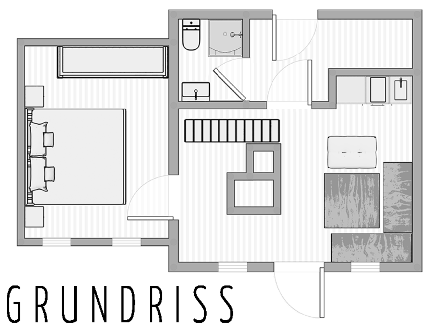 Ingang, badkamer met wc, woonkamer-eetkamer, slaapkamer met een tweepersoonsbed op de begane grond