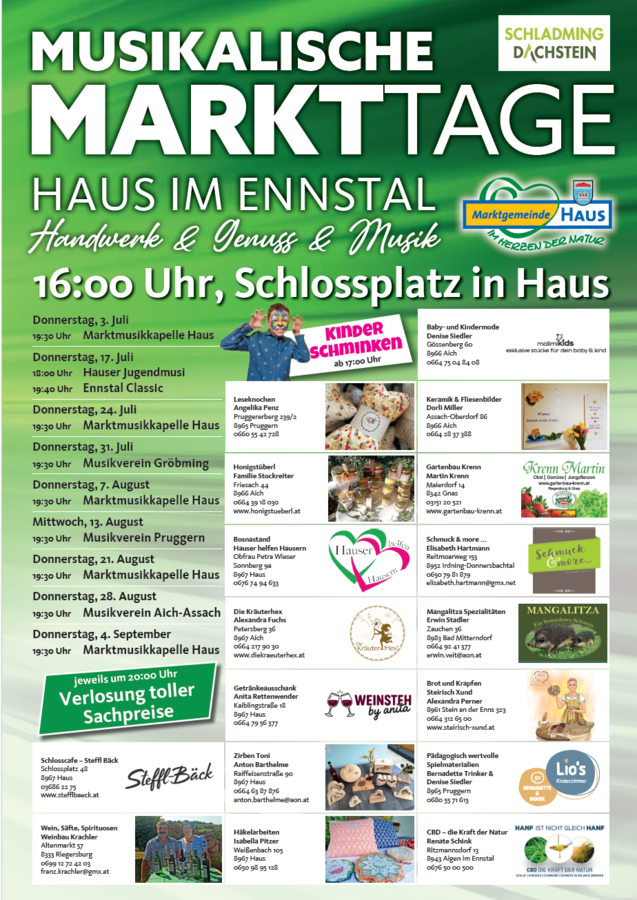 Every Thursday from July 3th to September 4th, the Schlossplatz in Haus im Ennstal will once again be a popular meeting place for locals and guests in summer 2025.