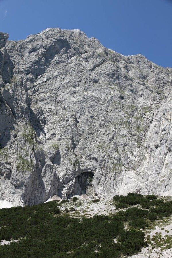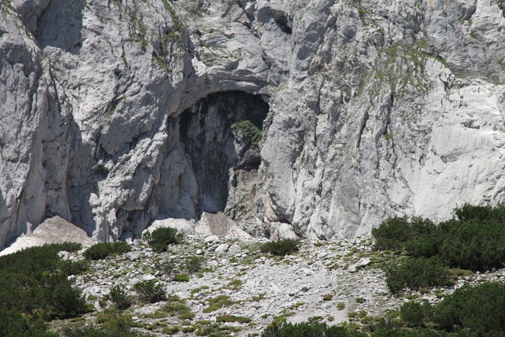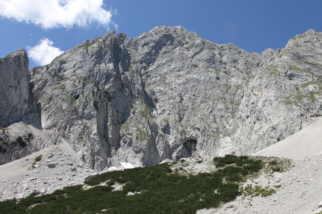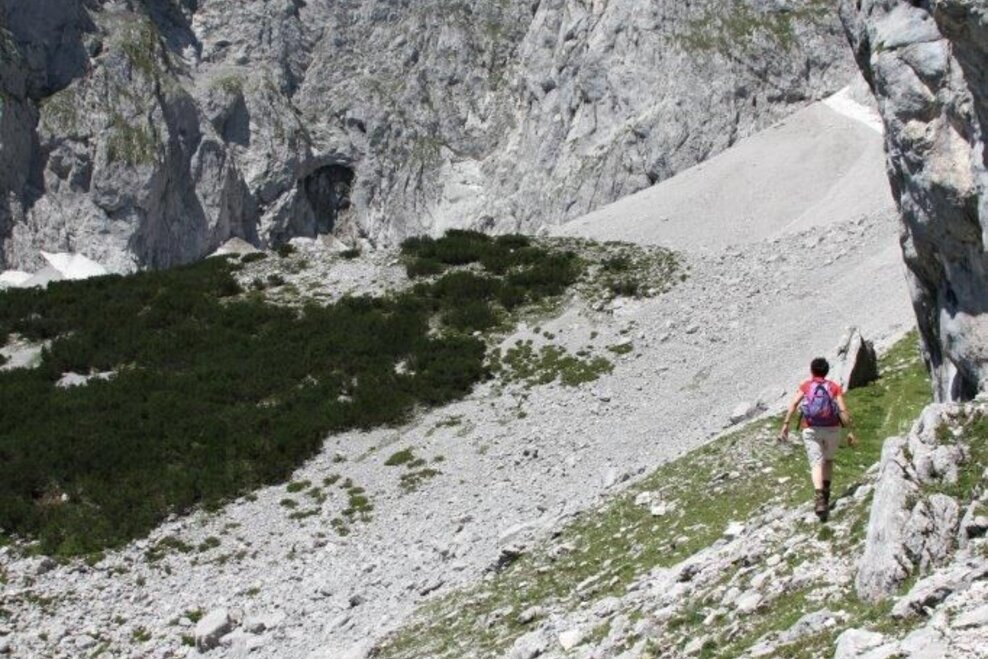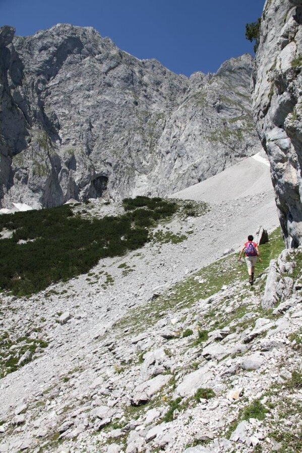 Go up through the beech forest (large rocks). Afterwards, go to the Jausengrube junction. A climb to the Grimming Tor would be feasible there but extremely dangerous (gravel climb, danger of falling rocks, snow).