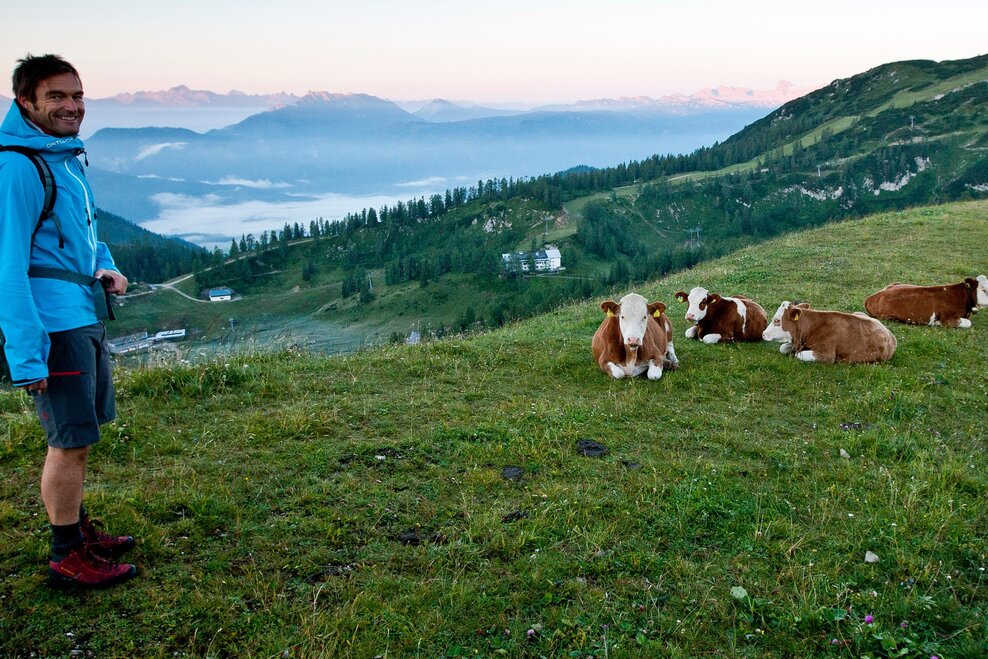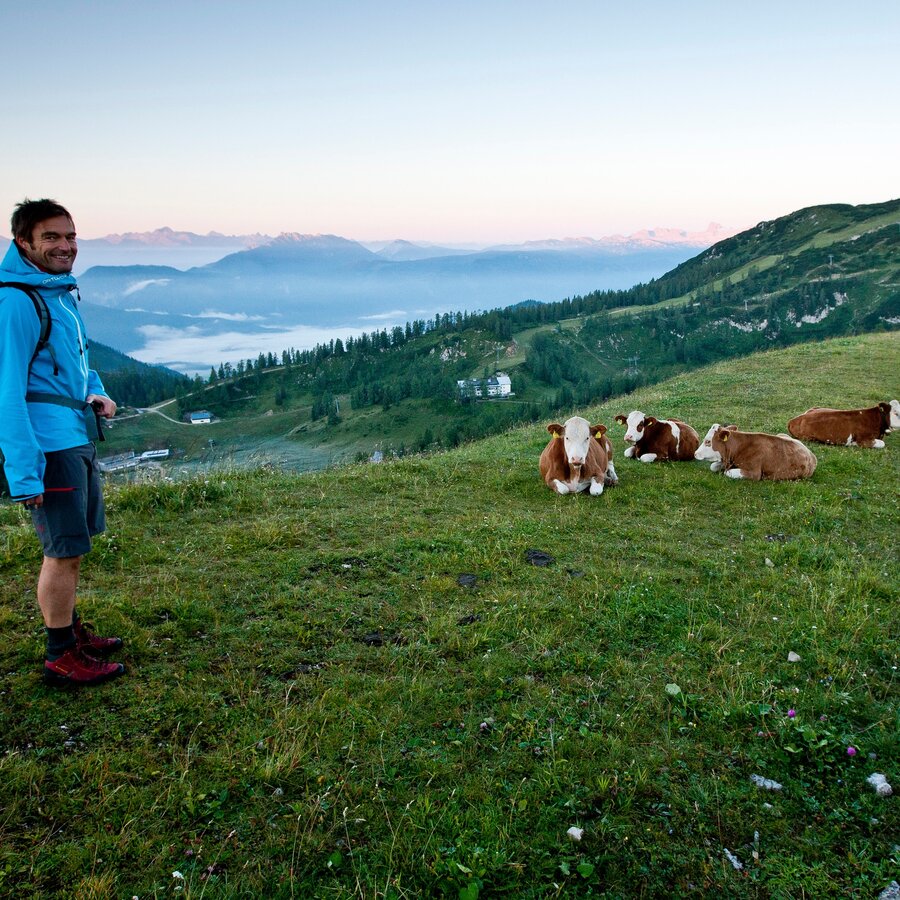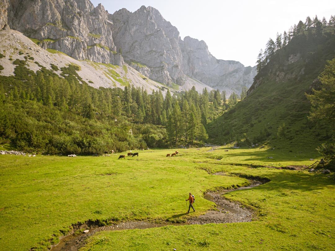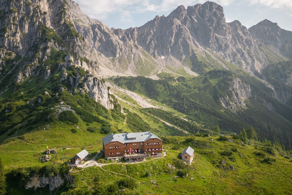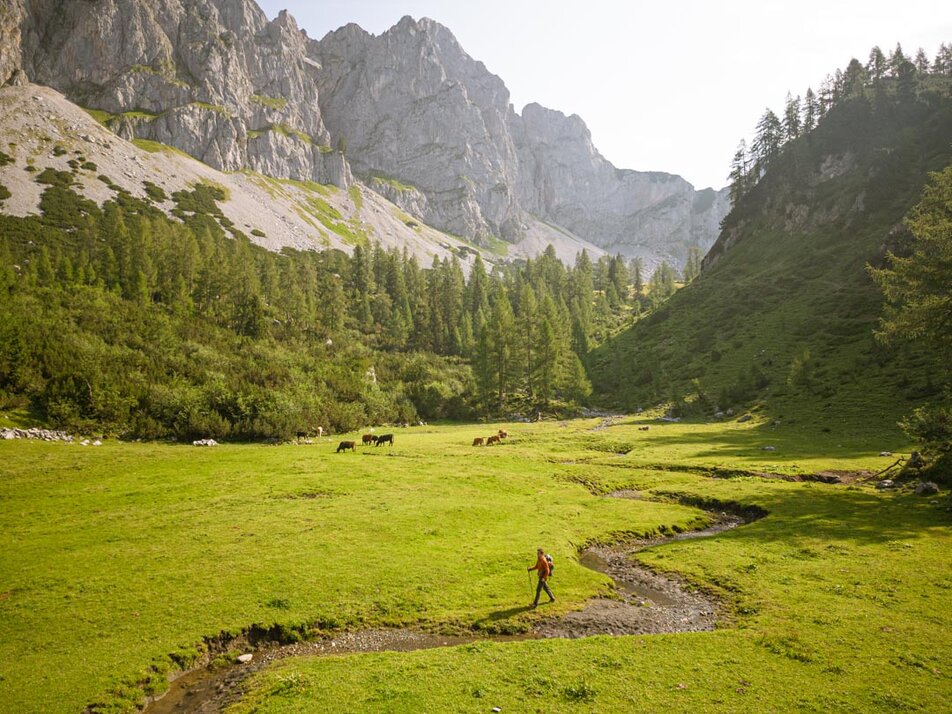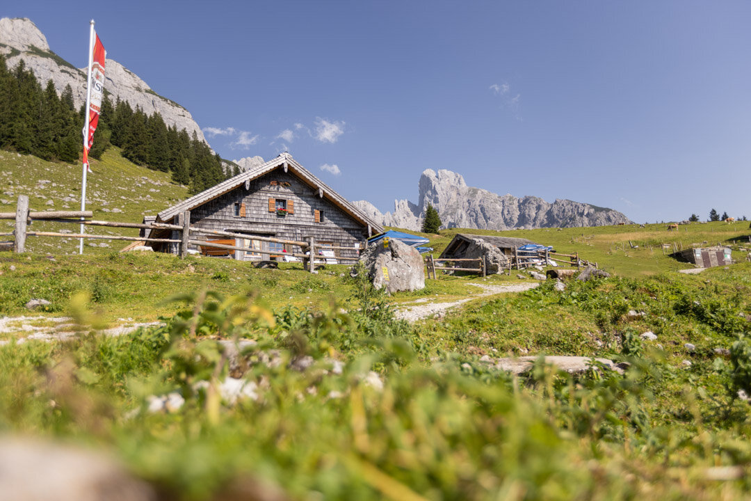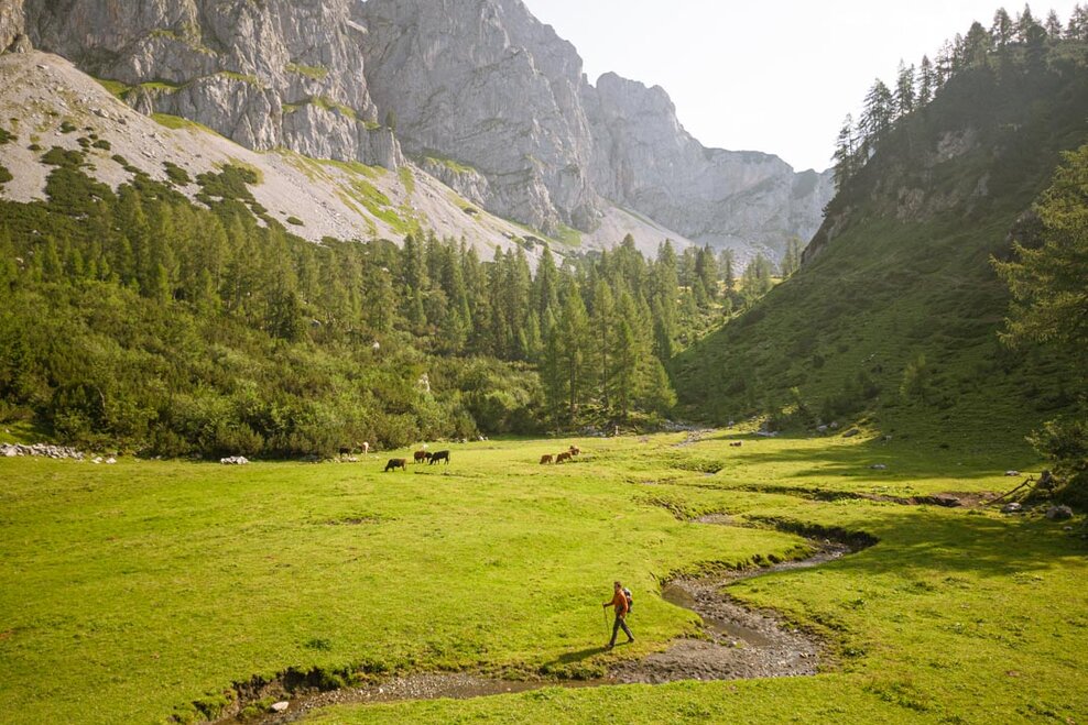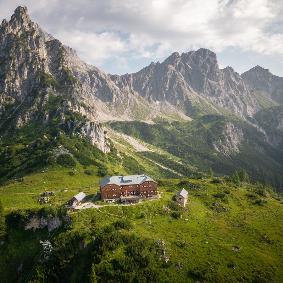 On the second stage of our tour we take the Austria Trail 612/601 + 617, a mountain trail that leads us ever closer to the Dachstein glacier. Slight gradients lead us over the Kesselwand, where we meet Stieglweg No. 612, which would lead us back to Gosau. However, we continue on path no. 612/601 + 617, which takes us over the large rubble heaps to the Rinderfeld. Here we are already above the tree line and have a beautiful view of the Hohe Tauern. On path 617 we walk uphill to the summit of Sulzenschneid and from there back downhill to the Sulzenhals. From here we walk along the Windlegerkar below the ridge to the so-called "Tor". Here we get a first impression of the destination of this stage - the Dachstein Südwandhütte. Now we cross the border between Salzburg and Styria. Up to the Torboden there are some serpentines and screes. We overcome the last small ascent of this stage and reach Schönbühel, where the Dachstein Südwandhütte also stands - the destination of our second stage.