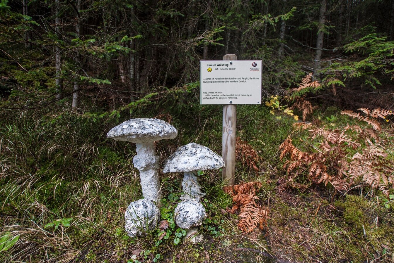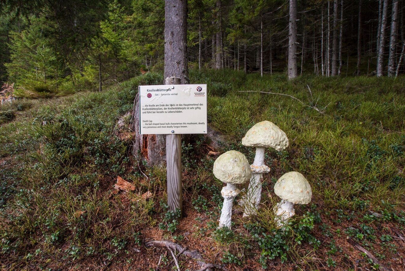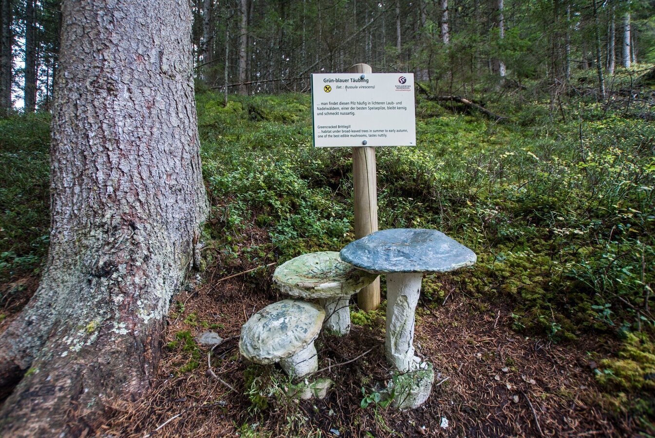 From the info boards at the hiking trail head in front of the valley terminal of Gipfelbahn Hochwurzen cable-car you pass by the sports shop „Schi Lenz“ on the left and walk towards the forestry road. Follow this for about 250 meters slightly uphill, then take the „Schwammerlweg“ (Mushroom Nature Path) to the left. Continue across the meadow and through the forst until you reach the “Mushroom Town”, a spot particularly popular with the kids.
