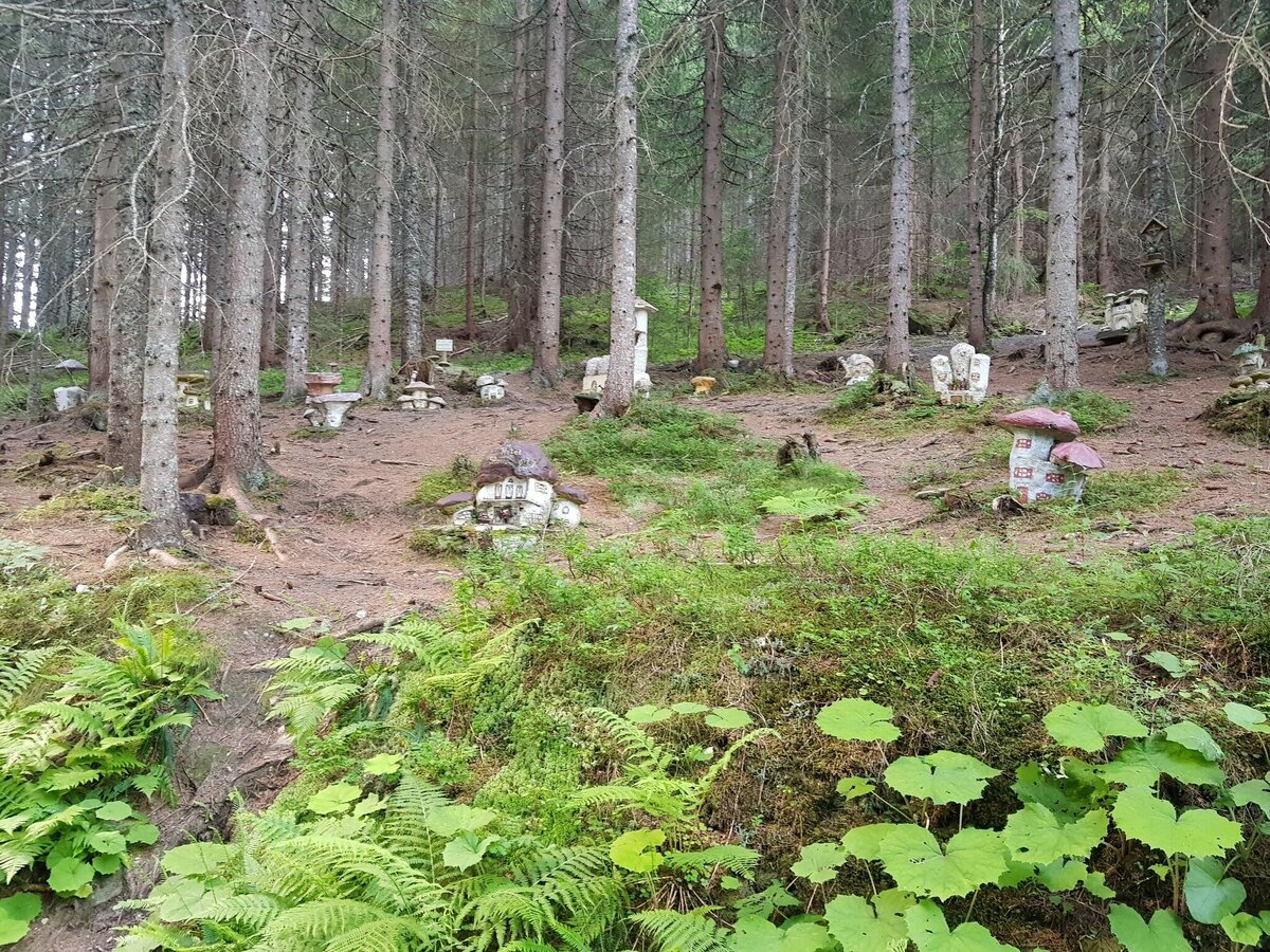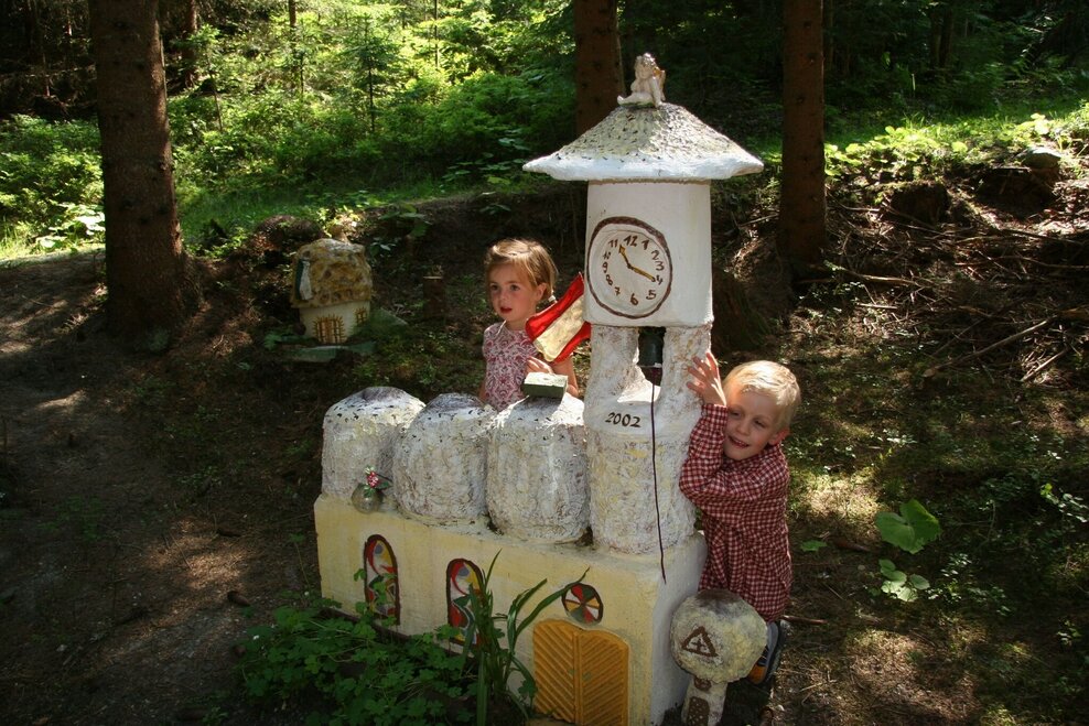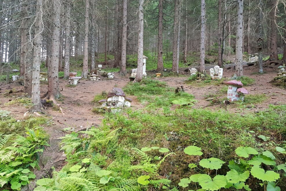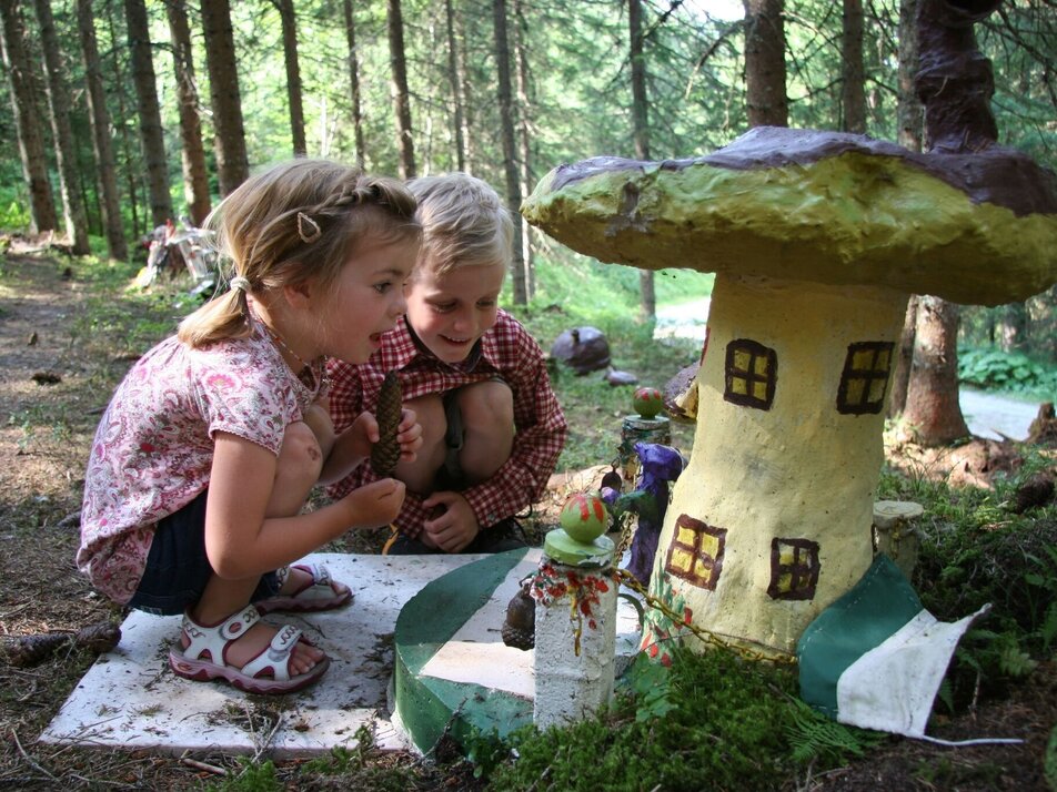 From the info boards at the hiking trail head in front of the valley terminal of Gipfelbahn Hochwurzen cable-car you pass by the sports shop „Schi Lenz“ on the left and walk towards the forestry road. Follow this for about 250 meters slightly uphill, then take the „Schwammerlweg“ (Mushroom Nature Path) to the left. Continue across the meadow and through the forst until you reach the “Mushroom Town”, a spot particularly popular with the kids.