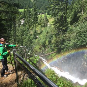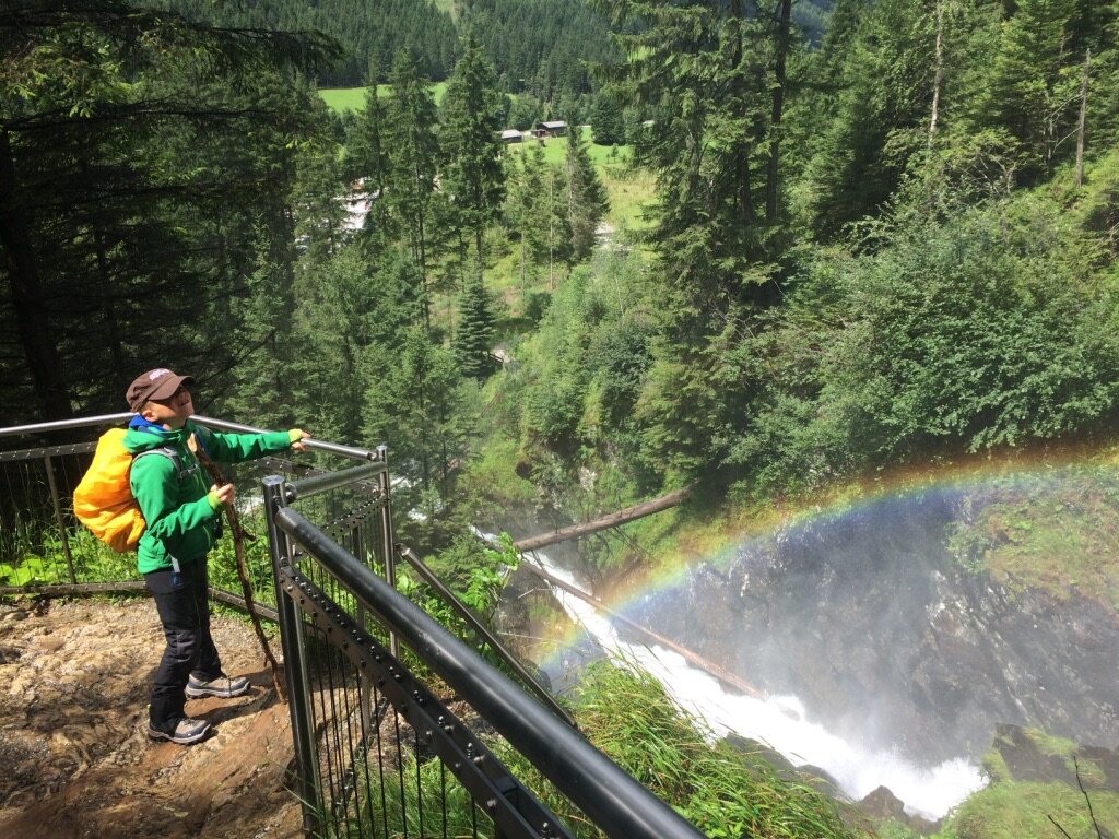 Mit den Kindern eine tolle Tour den Alpinsteig hinauf gemacht. Zu recht begeistert ist hier ein junger Bergsteiger vom Wasserfall mit Regenbogen!