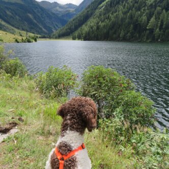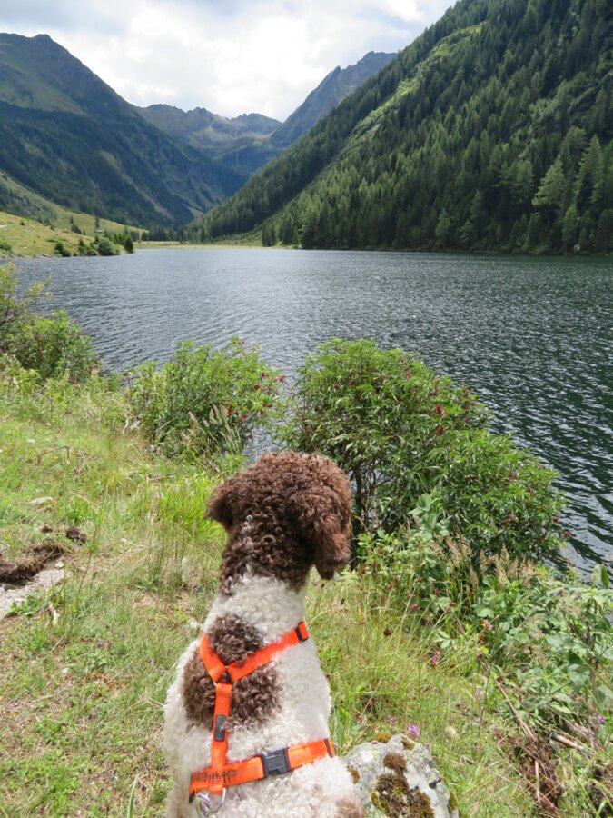 Heute schaut sich Flash, der Hund den Riesachsee an. An einem trüben Tag ist er tief dunkelgrün wie der geheimnisvolle Loch Ness. Die Kinder gehen durch den Alpinsteig Höll. Flash mag es eher gemütlich und platscht durchbdie Bacherln entlang der Forststrasse.
