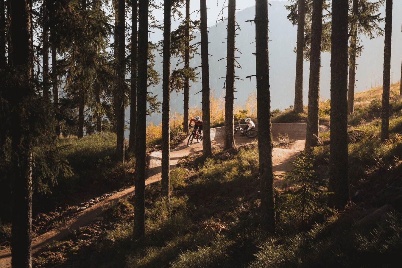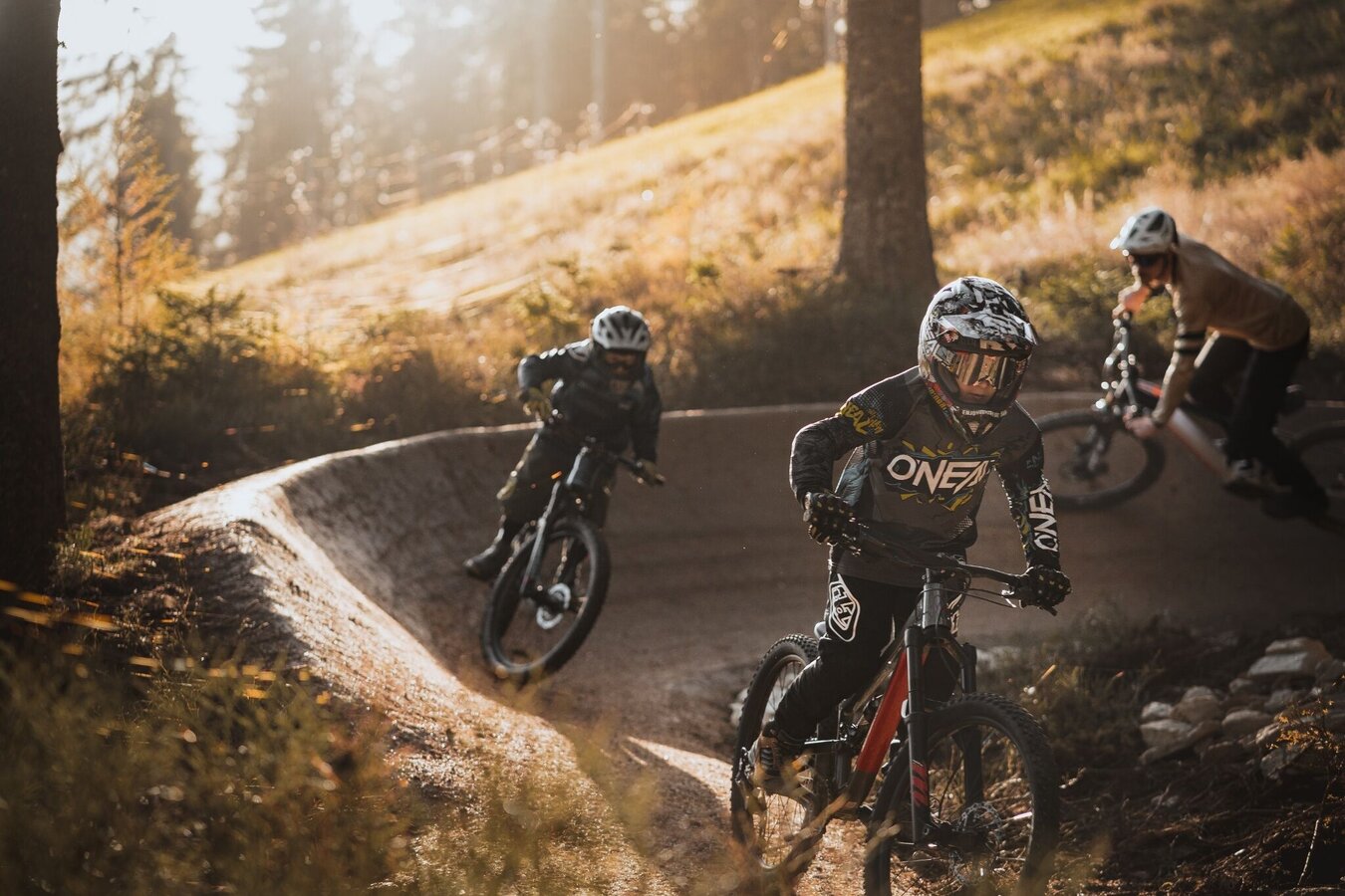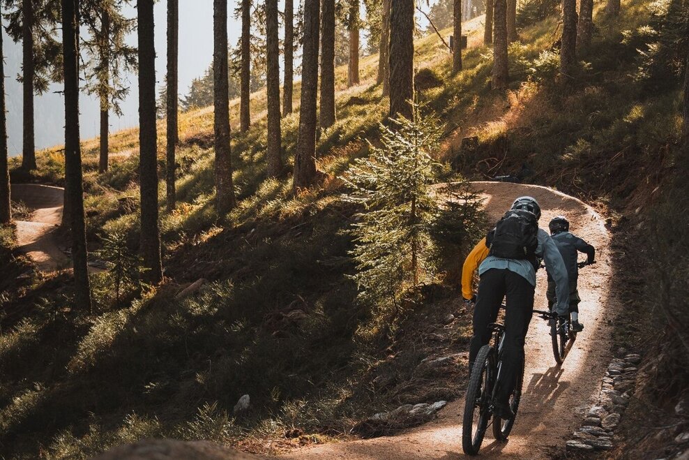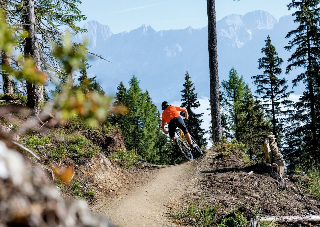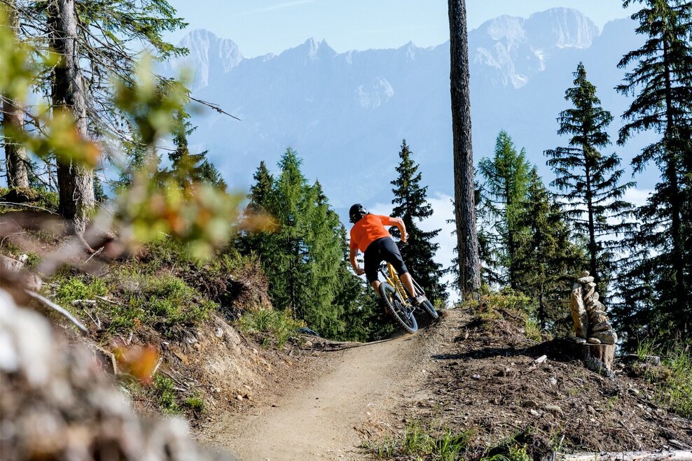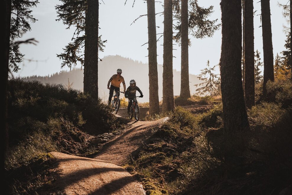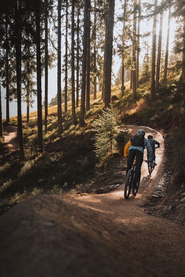 The Eiskar Trail begins directly at the Preunegg Jet mountain station and is also ideal for beginners. The trail is free of obstacles and steps and with its flowing course it invites you to leave your brakes open. After 300 m on a forest path, the Schnepfenwald Trail follows the continuation of the blue descent.