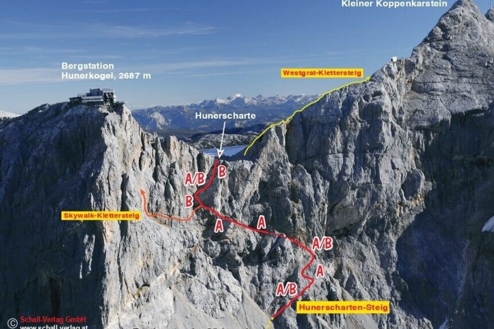 The climb up to the Hunerscharte is a well-known way to reach Dachstein glacier from the south, with permanent safety features for the final 200 vertical meters. For mountaineers in good condition, it leads directly to the Sky Walk Klettersteig, though is also a very attractive way to reach the Koppenkarstein Westgrat Klettersteig.