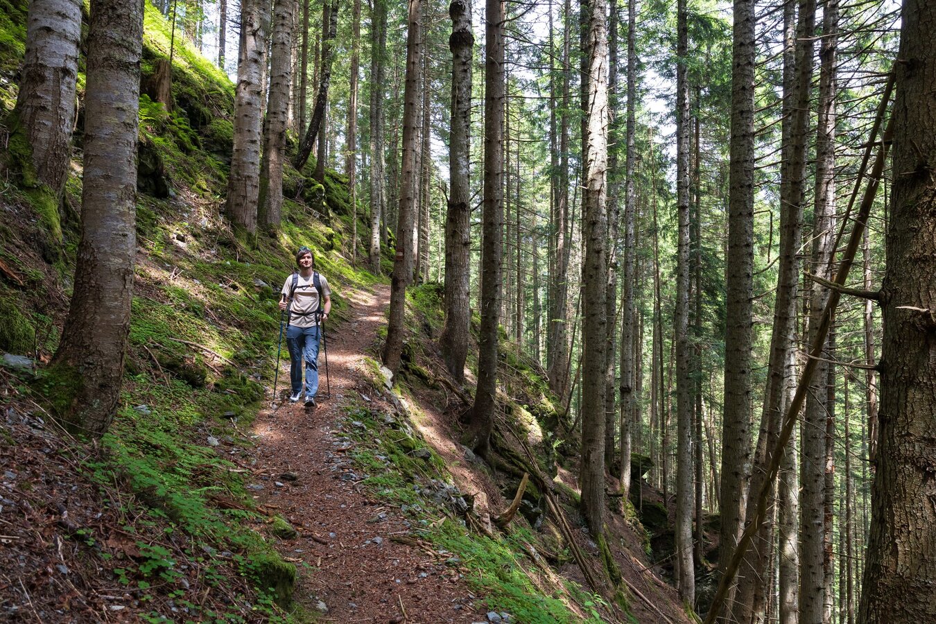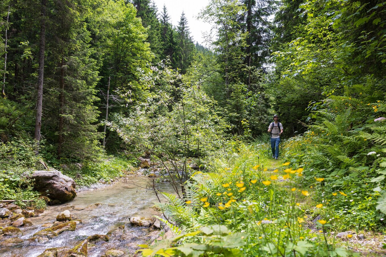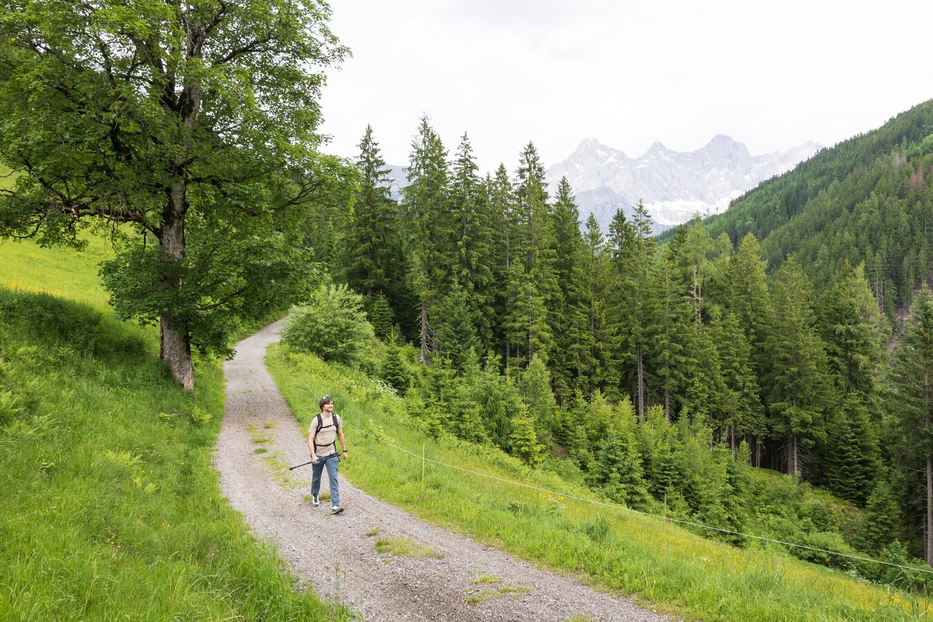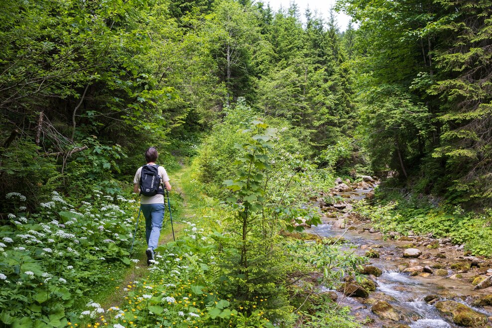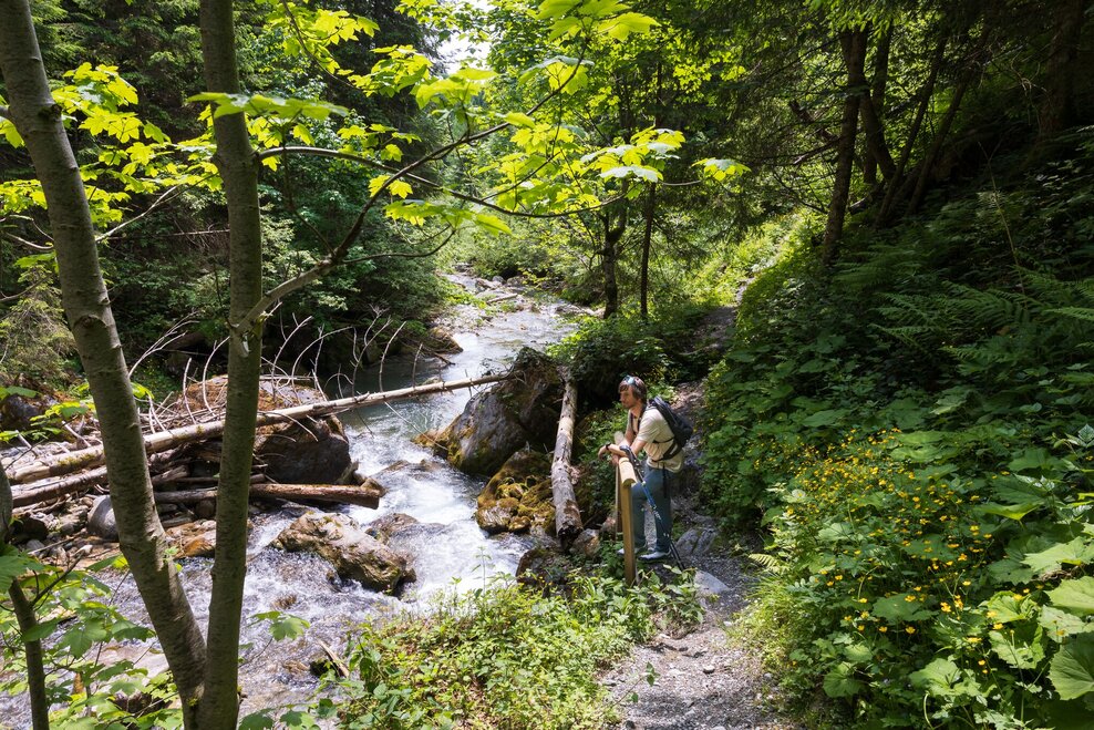 From Hotel-Gasthof Brunner you walk along Gleimingstraße towards the highway for a bit, before you turn off left onto the hiking & biking trail just after crossing the bridge over the Enns river. You follow the trail for about 2 km to the village of Mandling. Passing Gasthof Taferne and the loden manufacturer Steiner1888 you cross the bridge over the Mandling creek. After the bridge you make a right and - passing by bakery Lasser - follow the Mandling creek towards Filzmoos. The idyllic trail runs along the creek until you reach Grahsteig at the water reservoir.