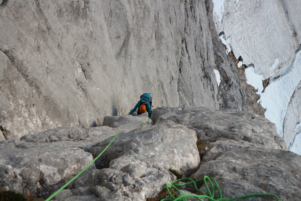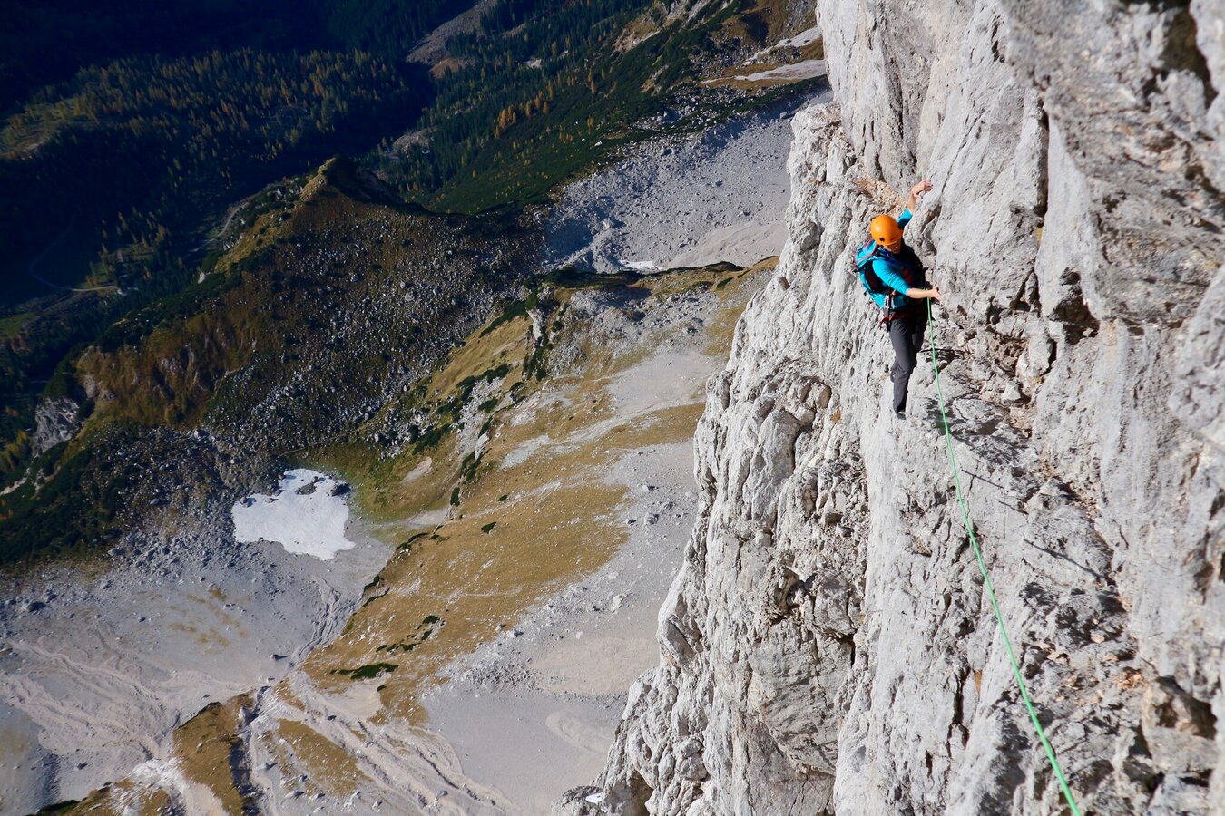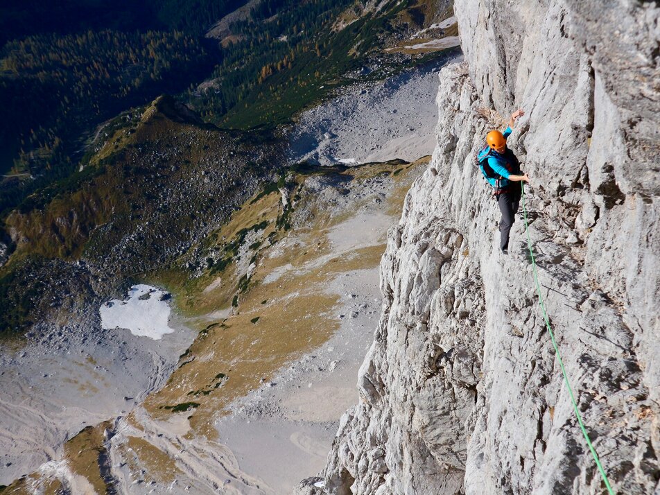 One of the great climbing classics in the Northern Limestone Alps. First climbed in 1909 by the two brothers “Irg” and Franz Steiner, who were the first to find a line directly through the imposing 850-meter-high south face.