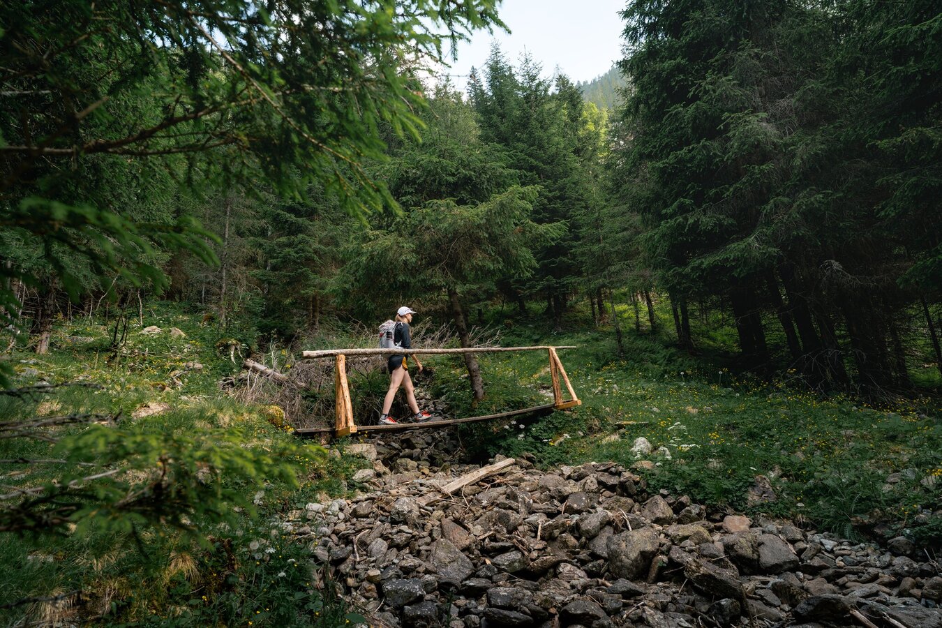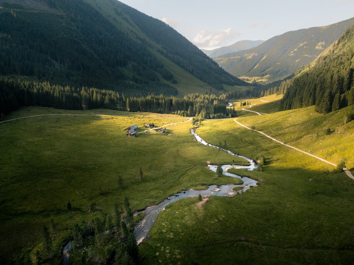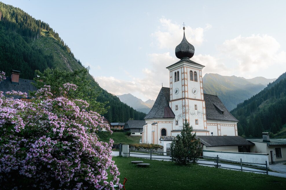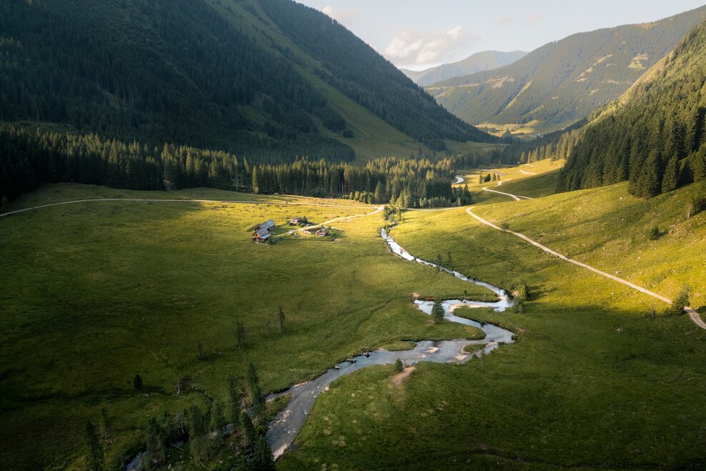 Past the Gasthof Gamsjäger with the small department store and the church you go to the last houses in the town. At the barrier, follow the forest road to the left towards Bräualm - path marker #702. After about a kilometer you reach the pasture area of the Bräualm, where the Bräualmbach meanders through the valley. The buildings of the Bräualm appear on the other side of the bank. The path leads you further into the valley to the crossing of the Bräualmbach at the Kreuzsteg. Here you can enjoy nature and the view of the Dürrmoos waterfall on a bench.