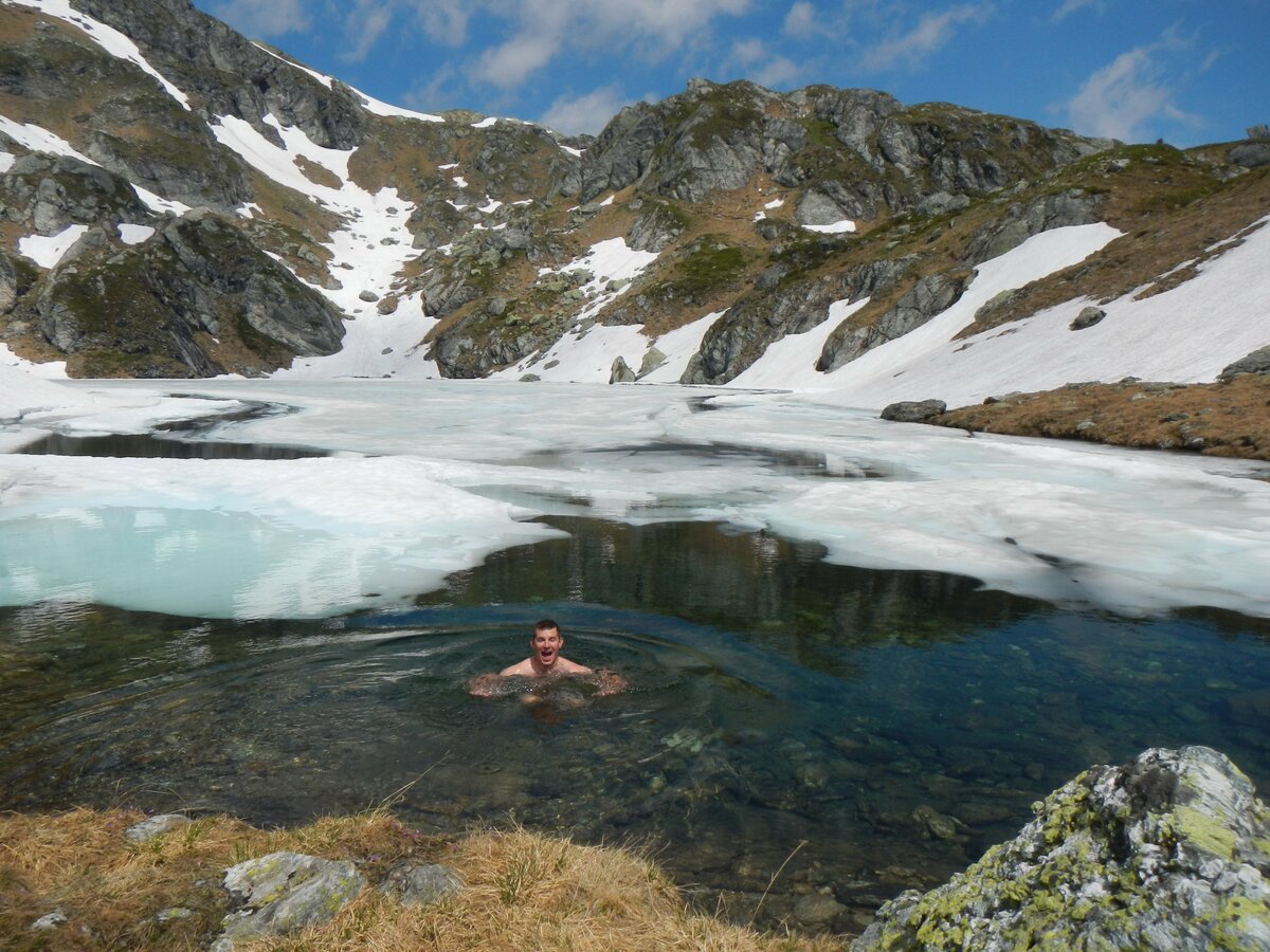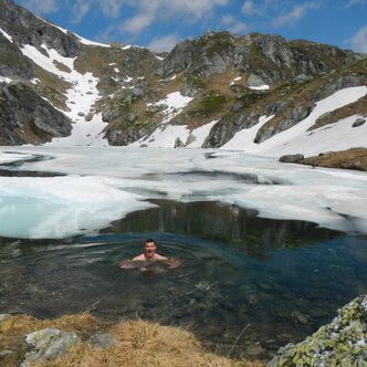 von der Ursprungalm erreicht man in ca. 2h den Brettersee in dem man ungestört ein Bad neben Eis und Schnne nehmen kann....