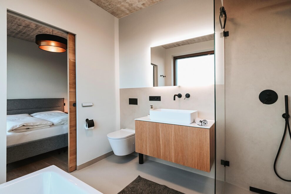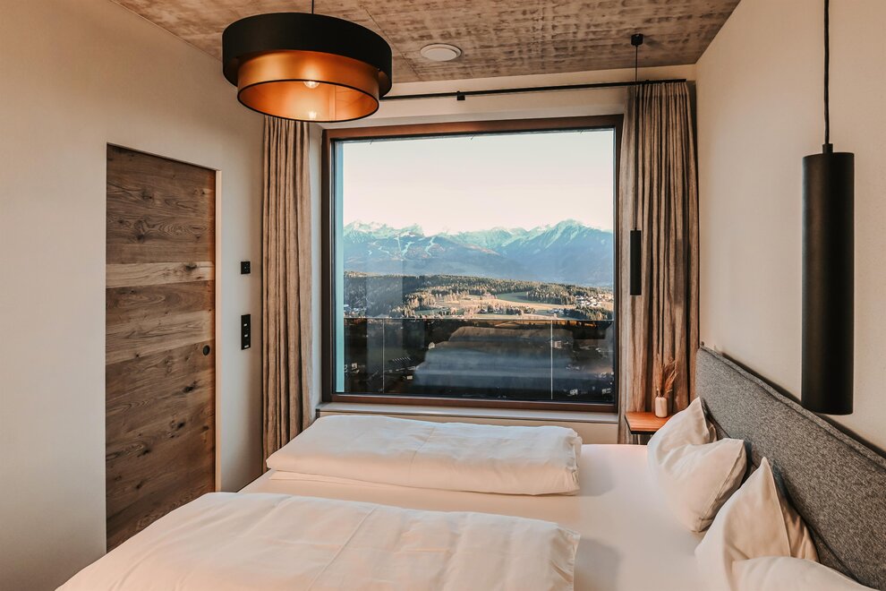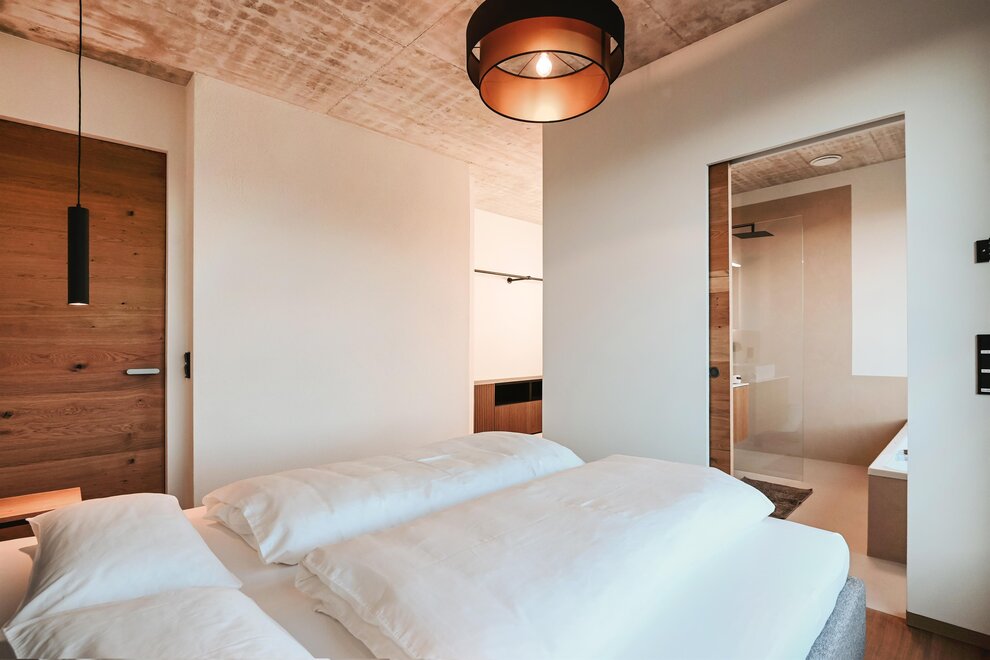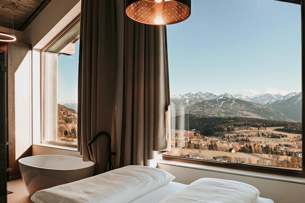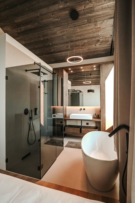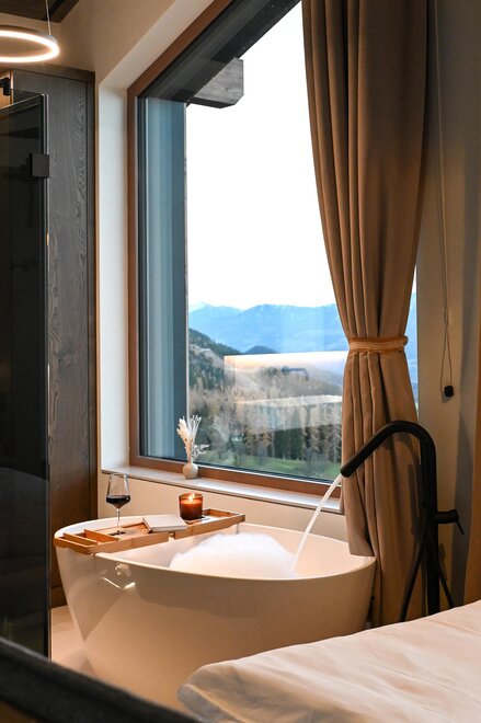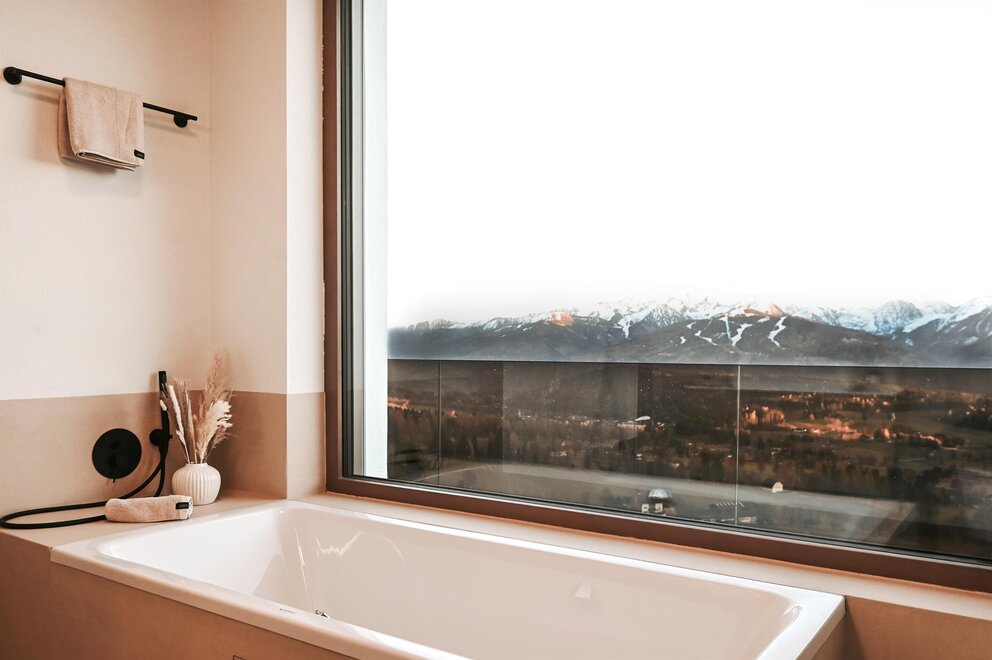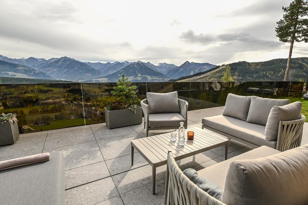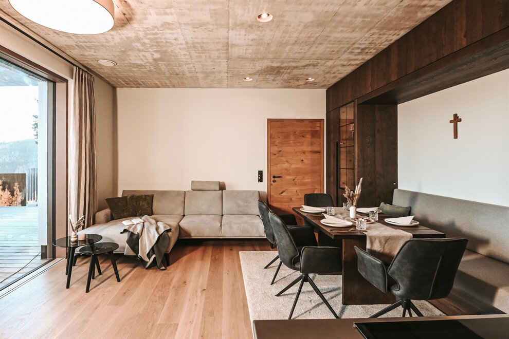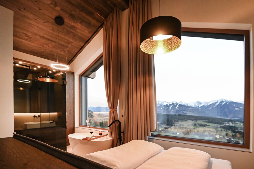Suite Panorama Herbert zachwyca otwartą przestrzenią i imponującym panoramicznym widokiem na Tauern i okoliczne góry. Duże okna wprowadzają naturę bezpośrednio do suite, tworząc jasną, spokojną atmosferę. Nowoczesny piec kominkowy zaprasza do przytulnych wieczorów, podczas gdy stylowy salon, oddzielna sypialnia i wysokiej jakości łazienka zapewniają najwyższy komfort. Suite łączy nowoczesny alpejski design z klarowną architekturą i jest idealna dla par lub osób poszukujących spokoju, które cenią przestronność, design i relaks.